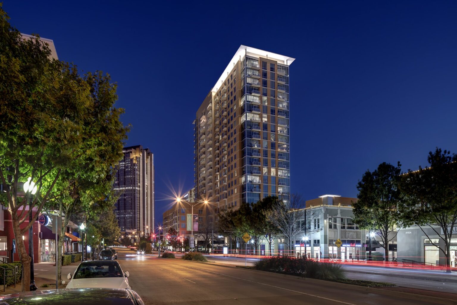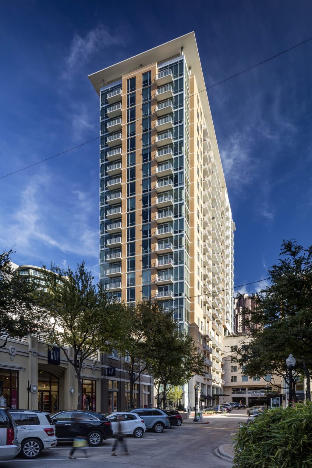 The residential component consists of a 21-story, 257-unit high-rise tower and 124 units of mid-rise wood-frame residential in four stories located atop the retail podium, totaling 428,600 square feet. Parking is provided for 836 cars in a seven-level garage, with a portion of the garage roof serving as an elevated amenity terrace offering spectacular downtown skyline views.