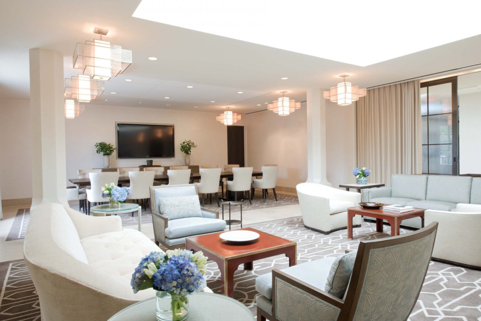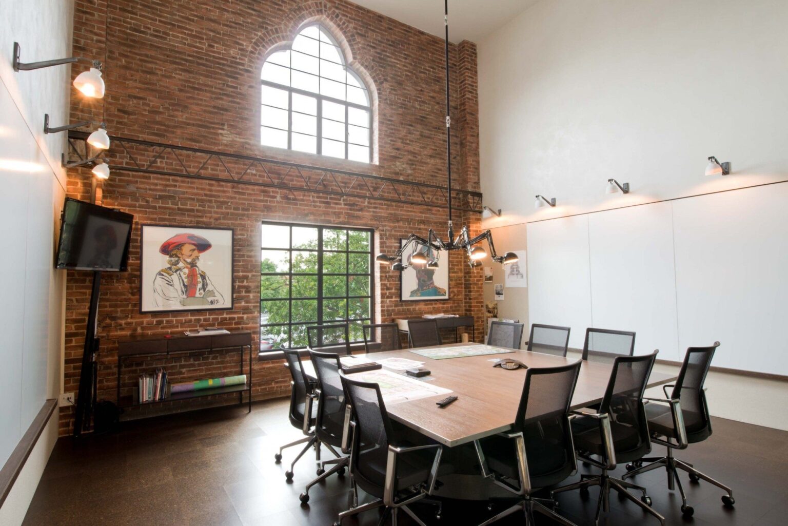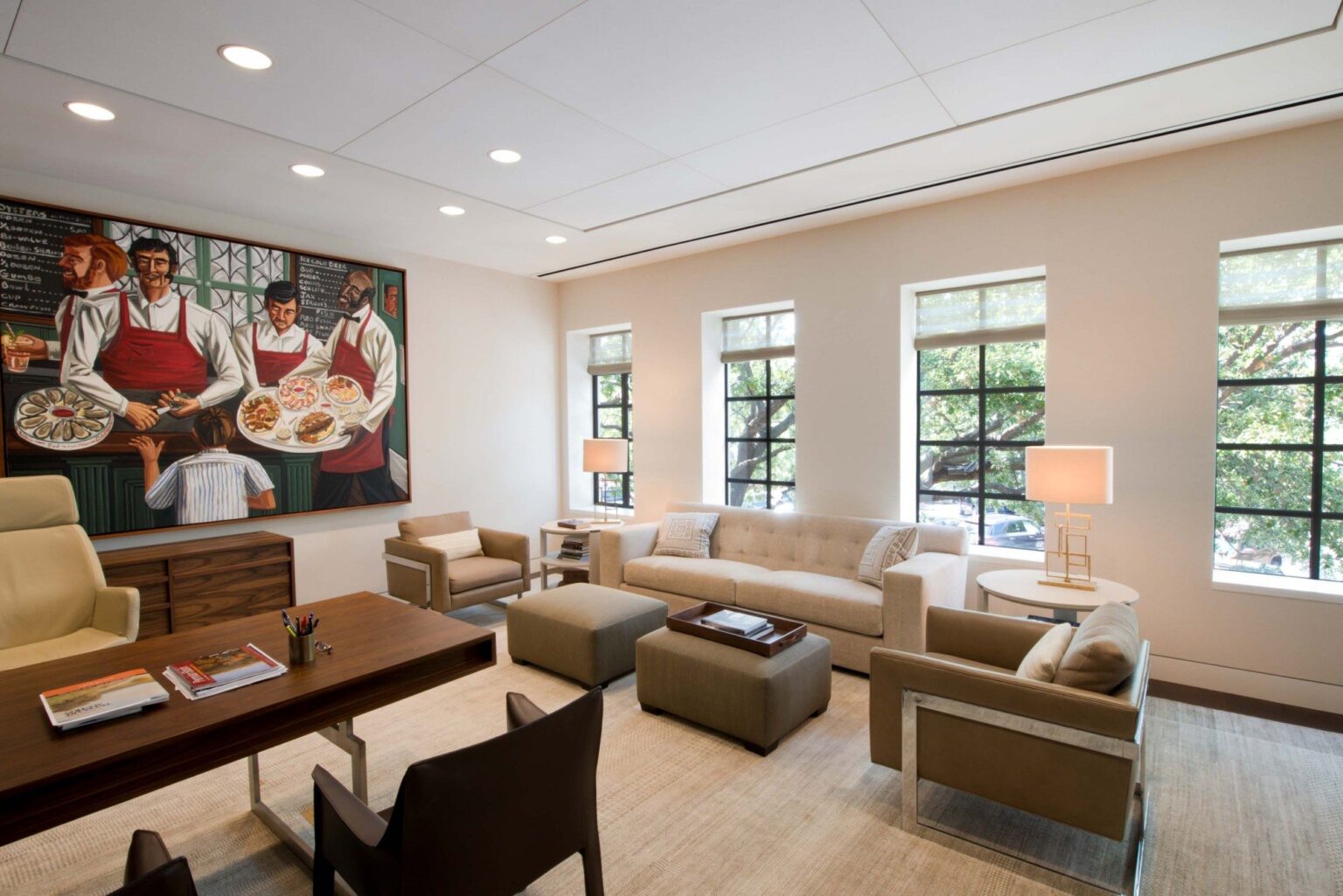 A dedicated first-floor entrance leads to a vast second-level lobby and community lounge, with natural light cascading down from large skylights above. This rich sequence of gathering spaces, luxurious offices, and refined conference rooms showcases the family’s legacy and dedication to their companies, clients, and the surrounding community. The project was executed in collaboration with Emily Summers Design Associates, ensuring a harmonious blend of modern luxury with historical significance.