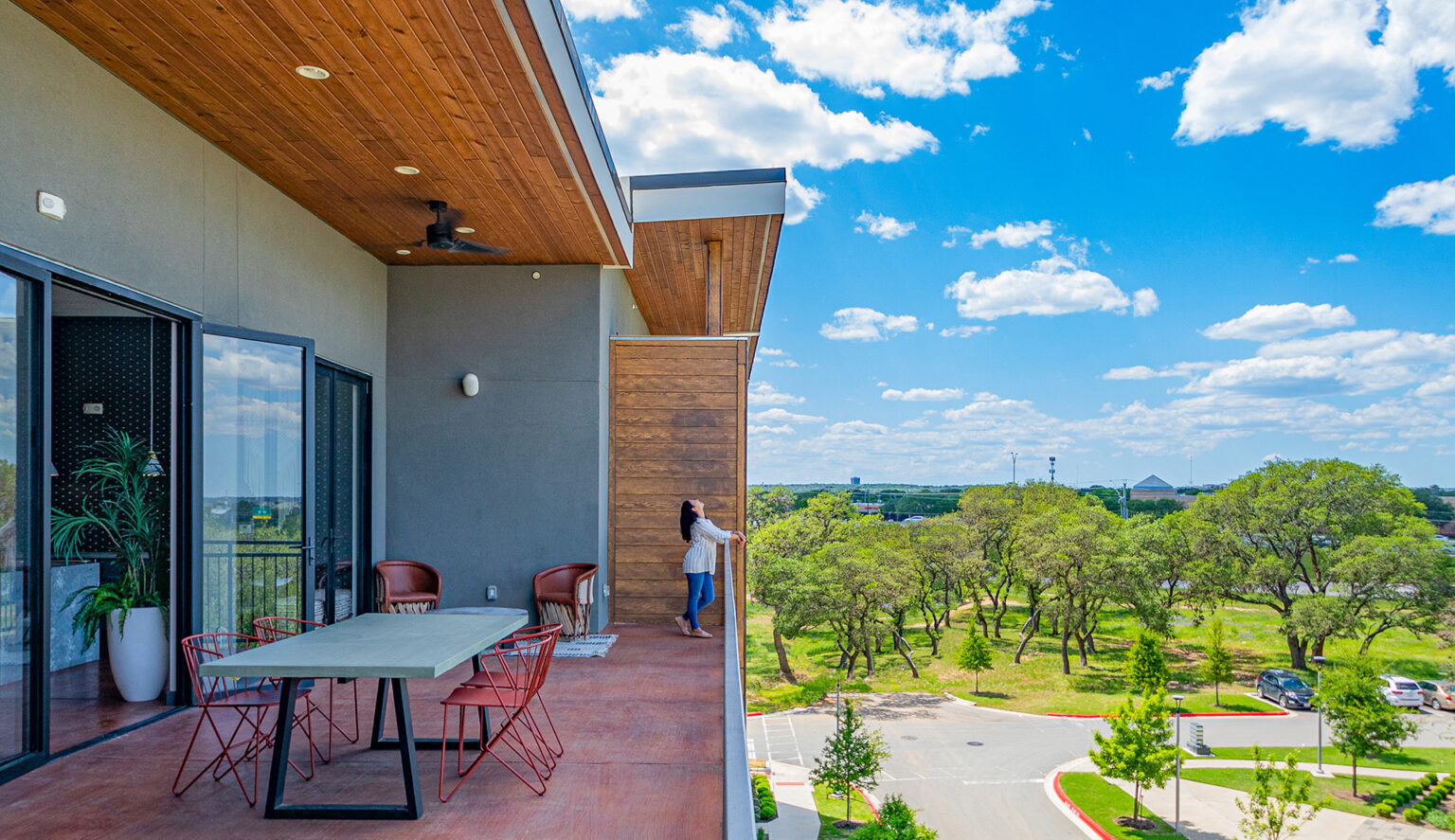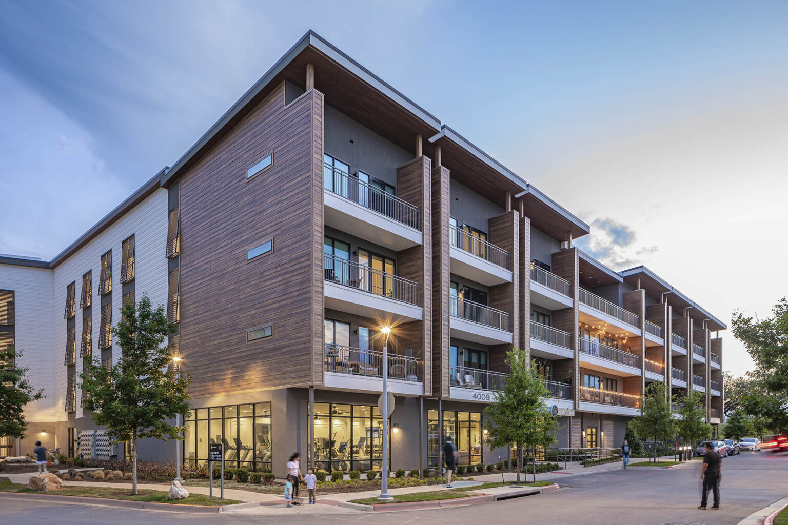 The four-story project wraps around a five-level precast parking garage, which is shielded from view to avoid any visual clutter. A roof deck on level four offers views towards downtown and the Barton Creek greenbelt. The trees and surrounding landscaping are complemented by wood-look siding and local masonry veneer that create the façade.