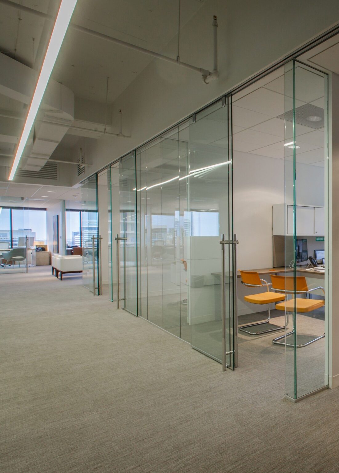 The heart of the office, inspired by the firm’s frequent social gatherings, features a floor-to-ceiling glass conference room and social lounge overlooking the lobby. GFF Interiors leveraged the building’s challenging saw-tooth facade by keeping perimeter spaces transparent to maximize city views and optimize daylight. Full glass office and conference room fronts enhance communication between employees. GFF Interiors transformed AvreaFoster’s workspace standards to provide a collaborative environment that complements the creative agency’s work style.