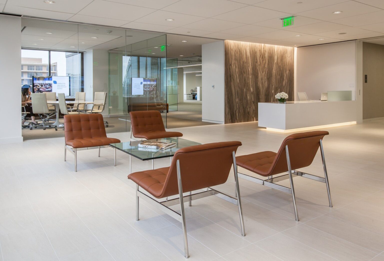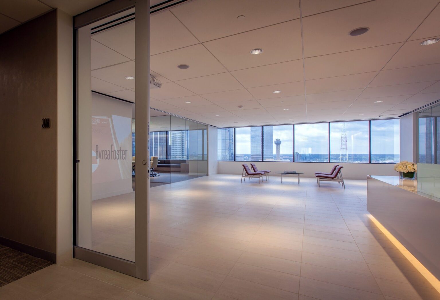 AvreaFoster, a branding and advertising firm, relocated to Ross Tower to accommodate their growing agency. With sweeping views of downtown Dallas, the design of their new 13,000 square foot space was driven by the desire to create an open office environment that fosters collaboration and creativity. An 11-foot wide sliding glass entry door creates a sense of openness, welcoming visitors from the elevator lobby. The full-height marble wall behind the white quartz reception desk provides a focal point and a sense of movement in the crisp, minimalist lobby.