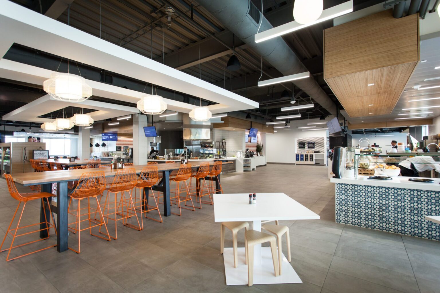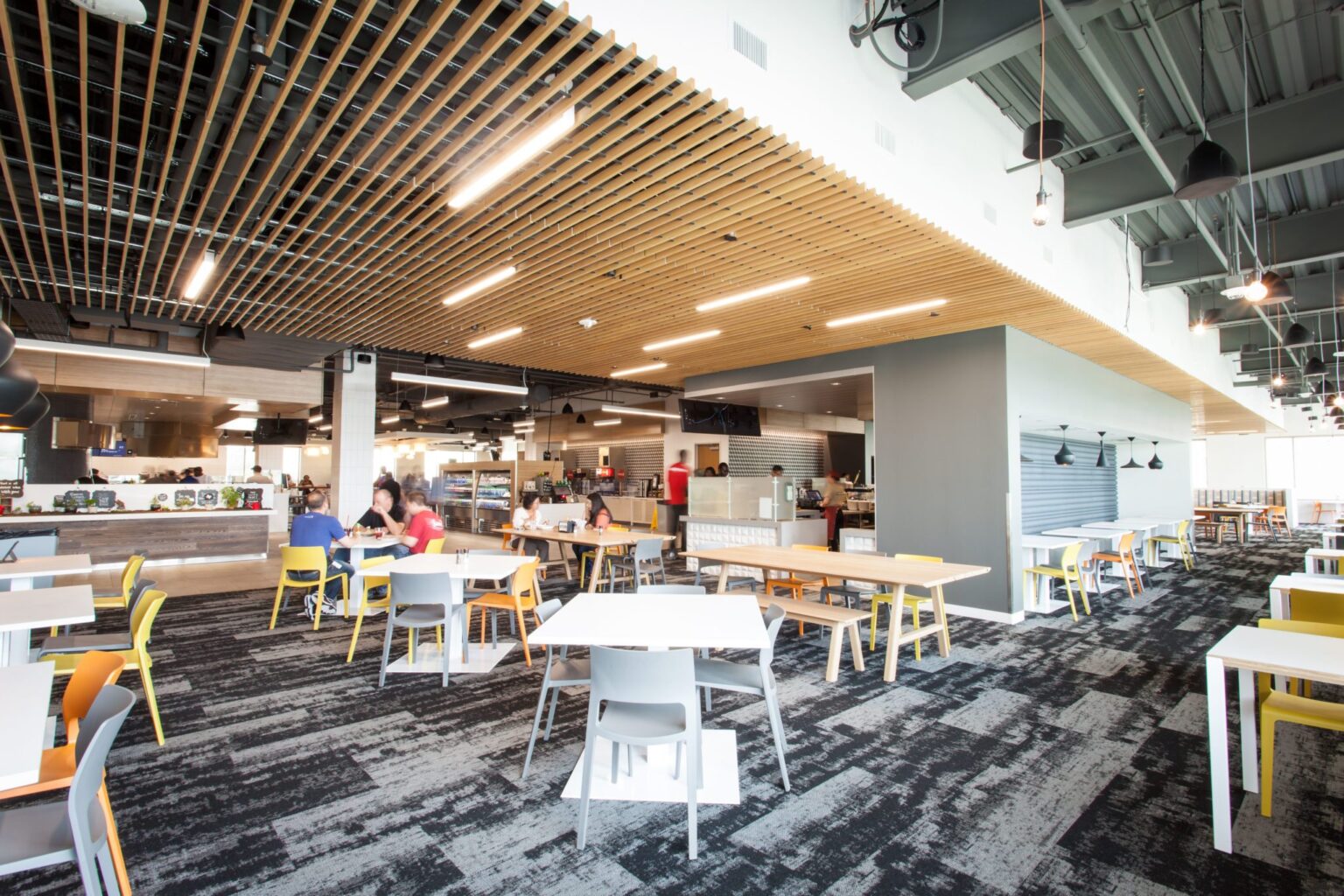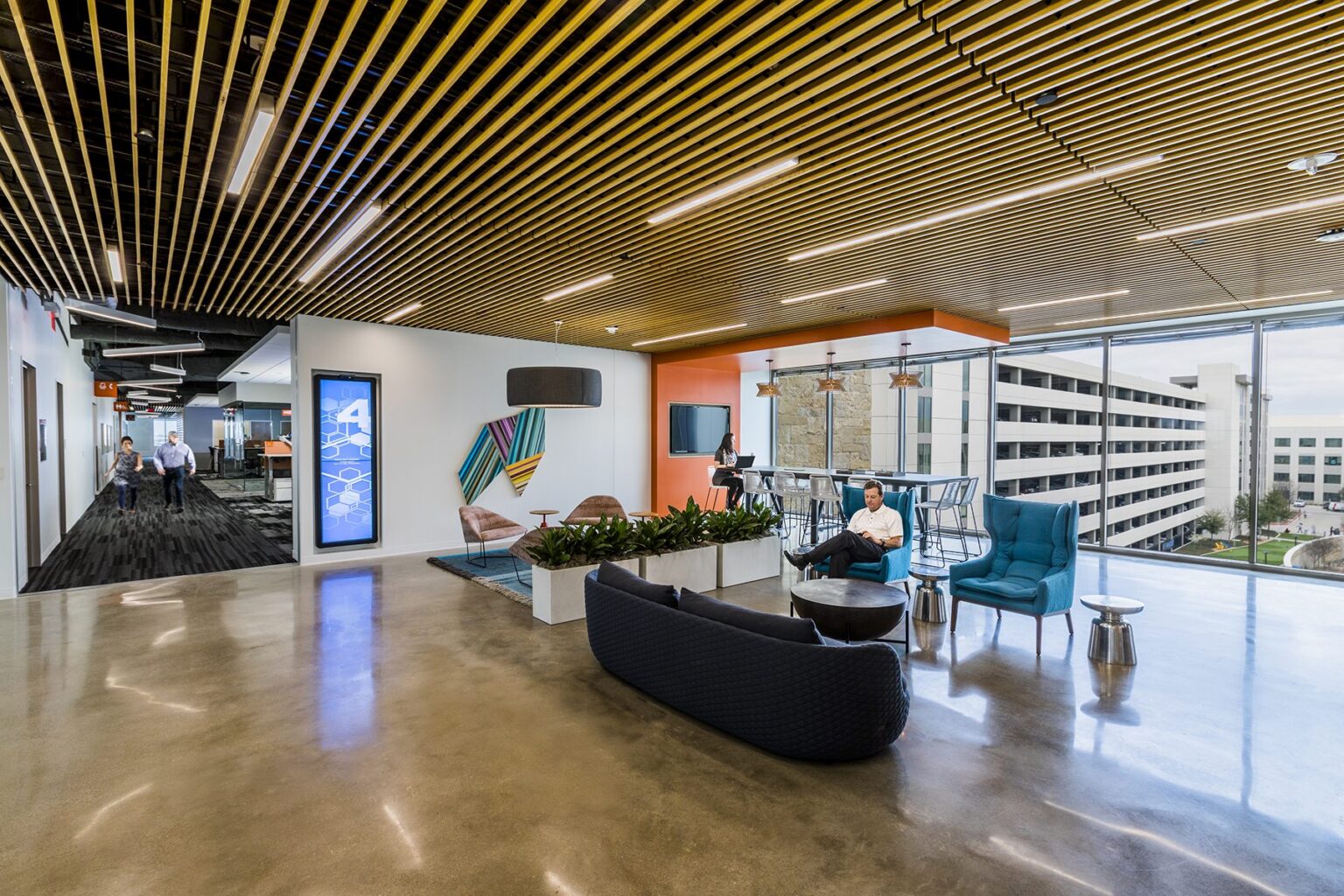 Each floor of the building is identified with a distinct color to provide wayfinding identification and create different atmospheres for users to experience. The use of wood and textural materials brings a sense of place to the workspace. A combination of acoustical ceiling tiles and exposed ceilings defines work zones and corridor areas, creating a more cohesive experience. The environment is designed to be fun, unique, and dynamic. Additionally, a full-service cafeteria and barista offer amenities for users to take breaks from the open office setting.