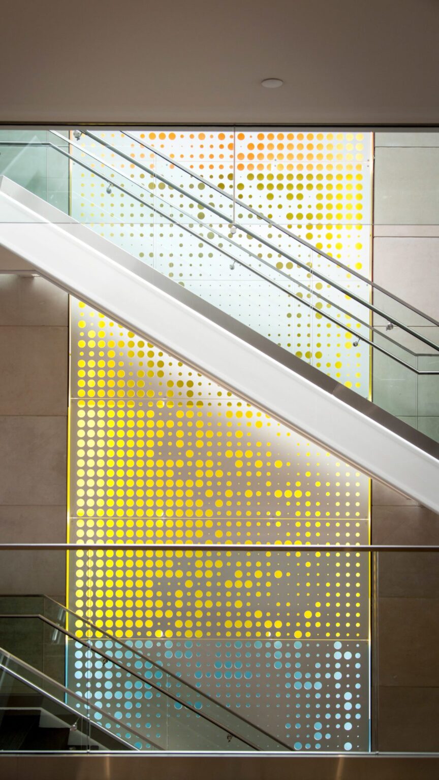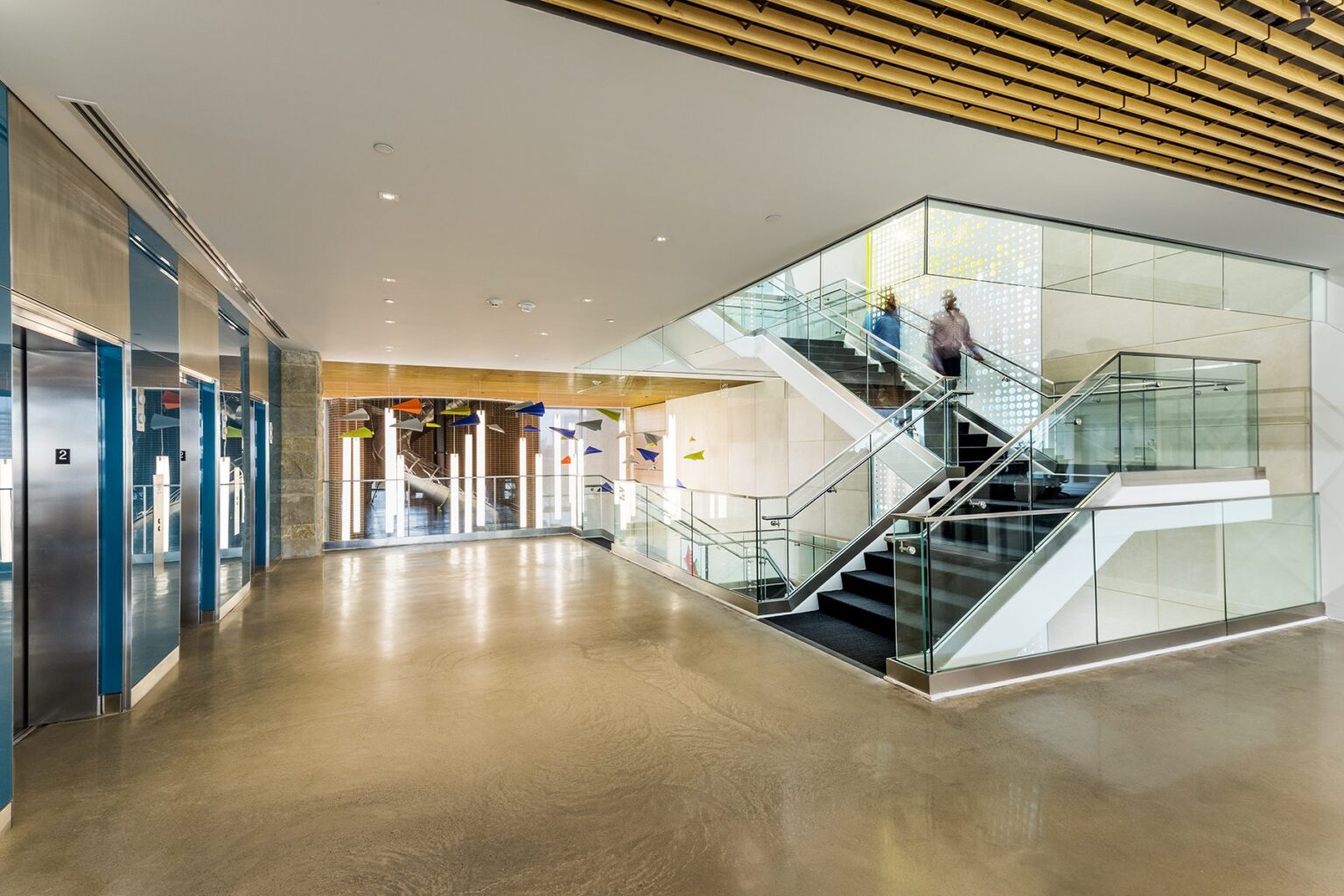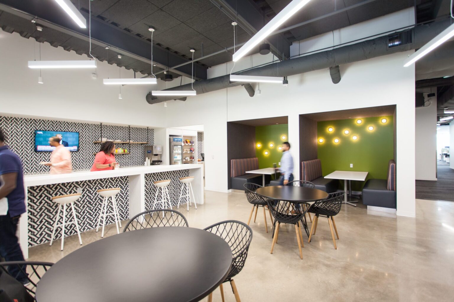 Each floor of the building is identified with a distinct color to provide wayfinding identification and create different atmospheres for users to experience. The use of wood and textural materials brings a sense of place to the workspace. A combination of acoustical ceiling tiles and exposed ceilings defines work zones and corridor areas, creating a more cohesive experience. The environment is designed to be fun, unique, and dynamic. Additionally, a full-service cafeteria and barista offer amenities for users to take breaks from the open office setting.