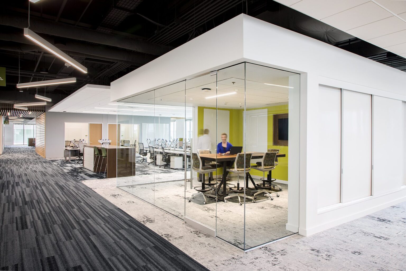 Capital One sought a workspace that reflects their innovative working methodology, fosters creative thinking, and sparks diverse ideas. The flexible open office environment is organized around ‘Pods,’ which include spaces for workstations with mobile tables, large team work areas, smaller collaboration zones, and intimate spaces for focused individual work. The design accommodates various settings where employees can meet informally, find a space to work, or relax away from the open office environment, offering multiple opportunities for impromptu collaboration throughout the building.