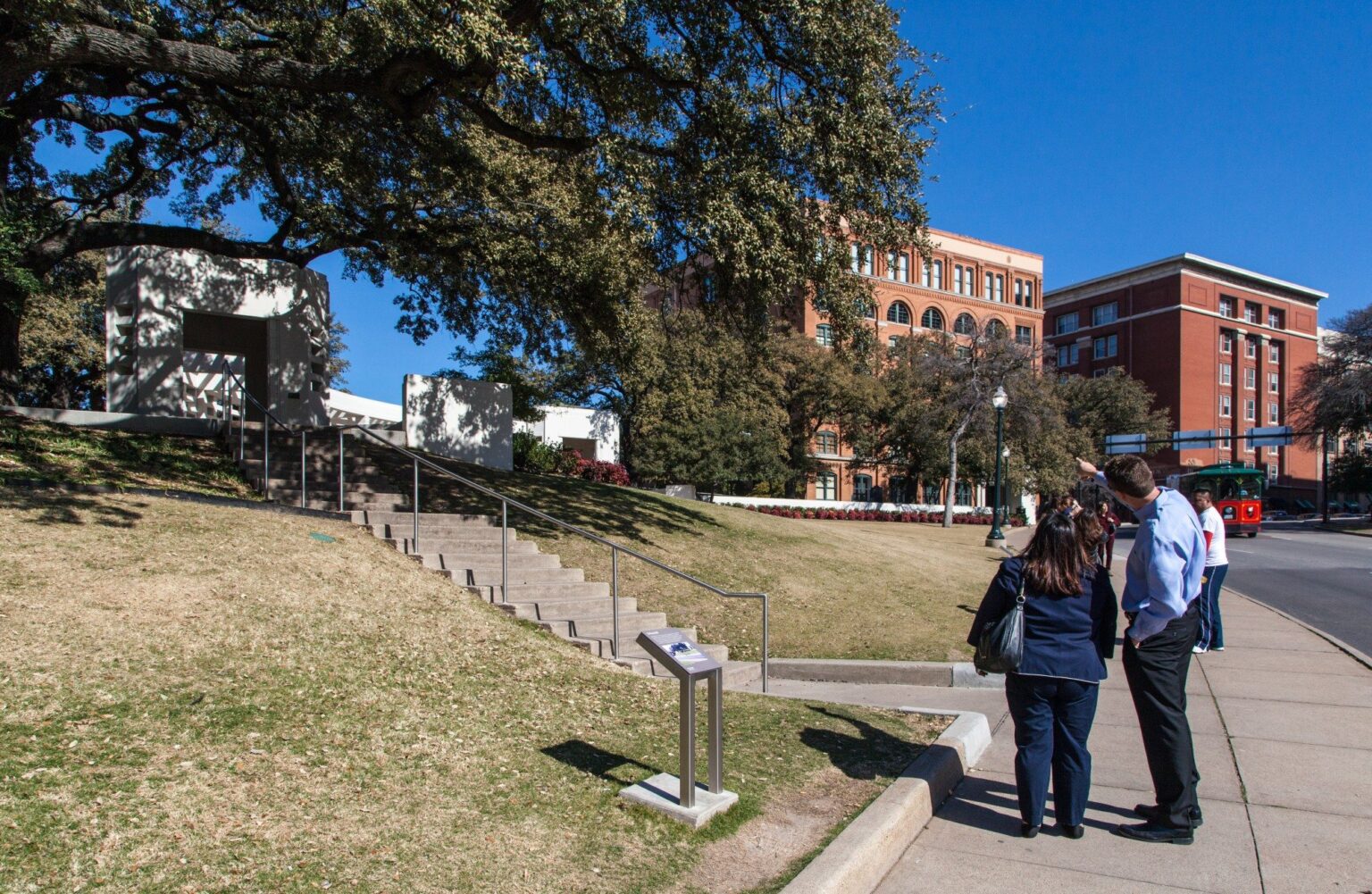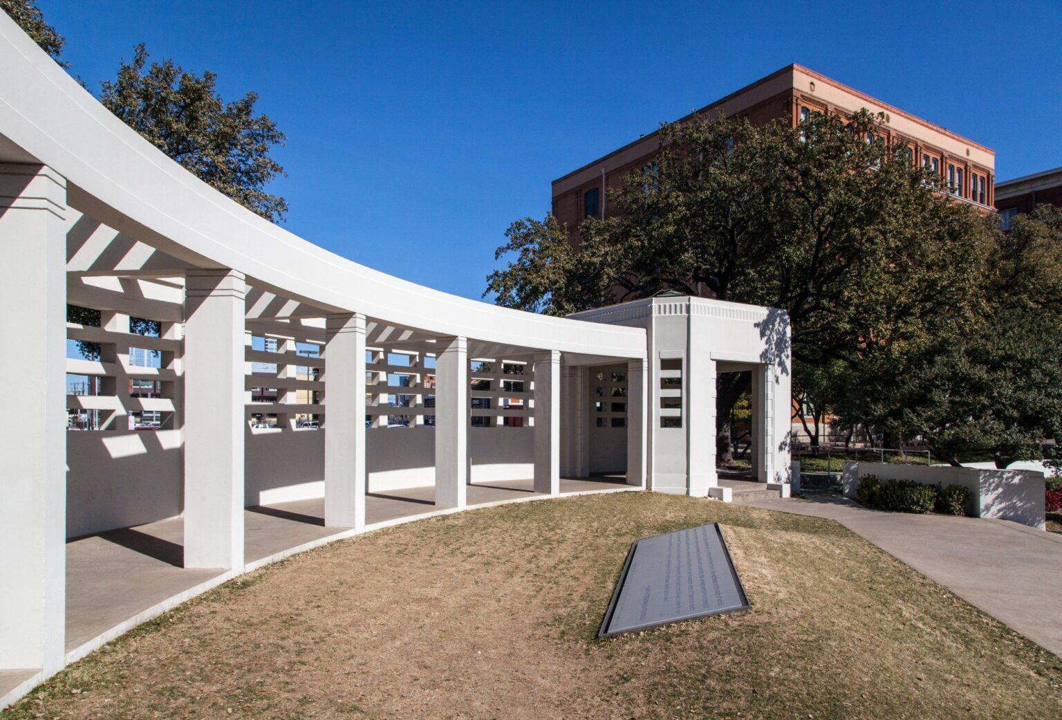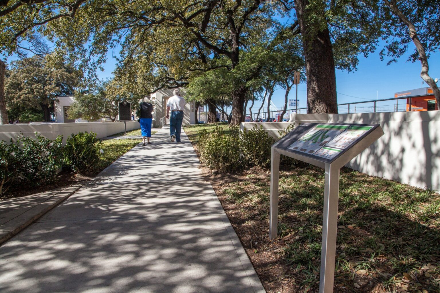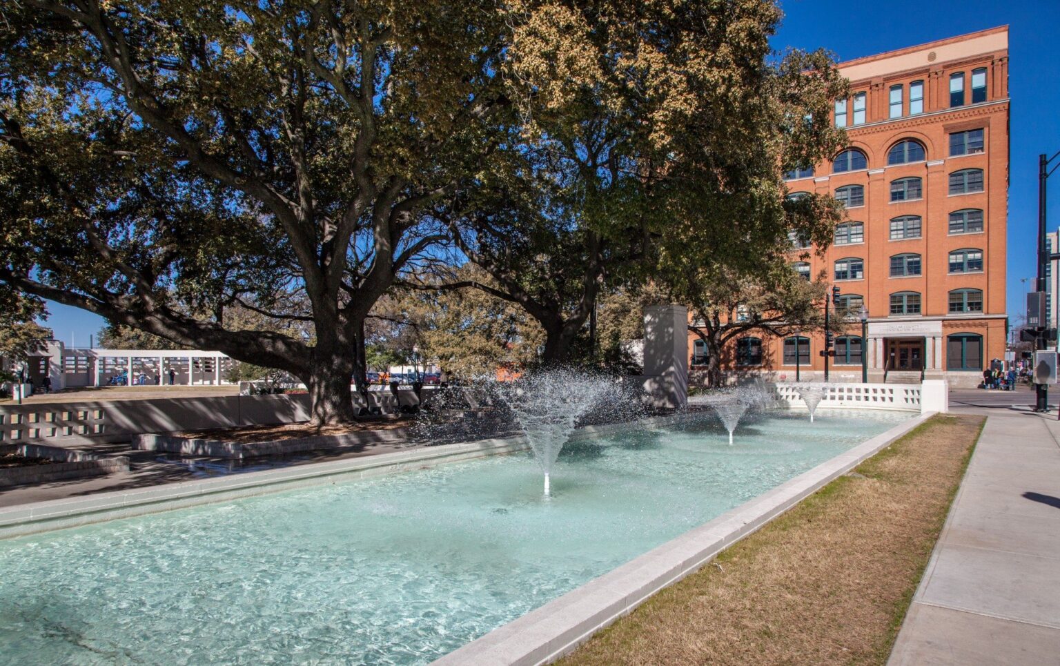 The more comprehensive Phase Two restoration was completed prior to the 50th anniversary of the Kennedy assassination in November 2013. This scope included restoration of the north and south pergolas, restoration of additional paving and steps, restoration of the fountains, improvements for accessibility, new interpretive graphics, and restoration of the landscaping across the entire site.