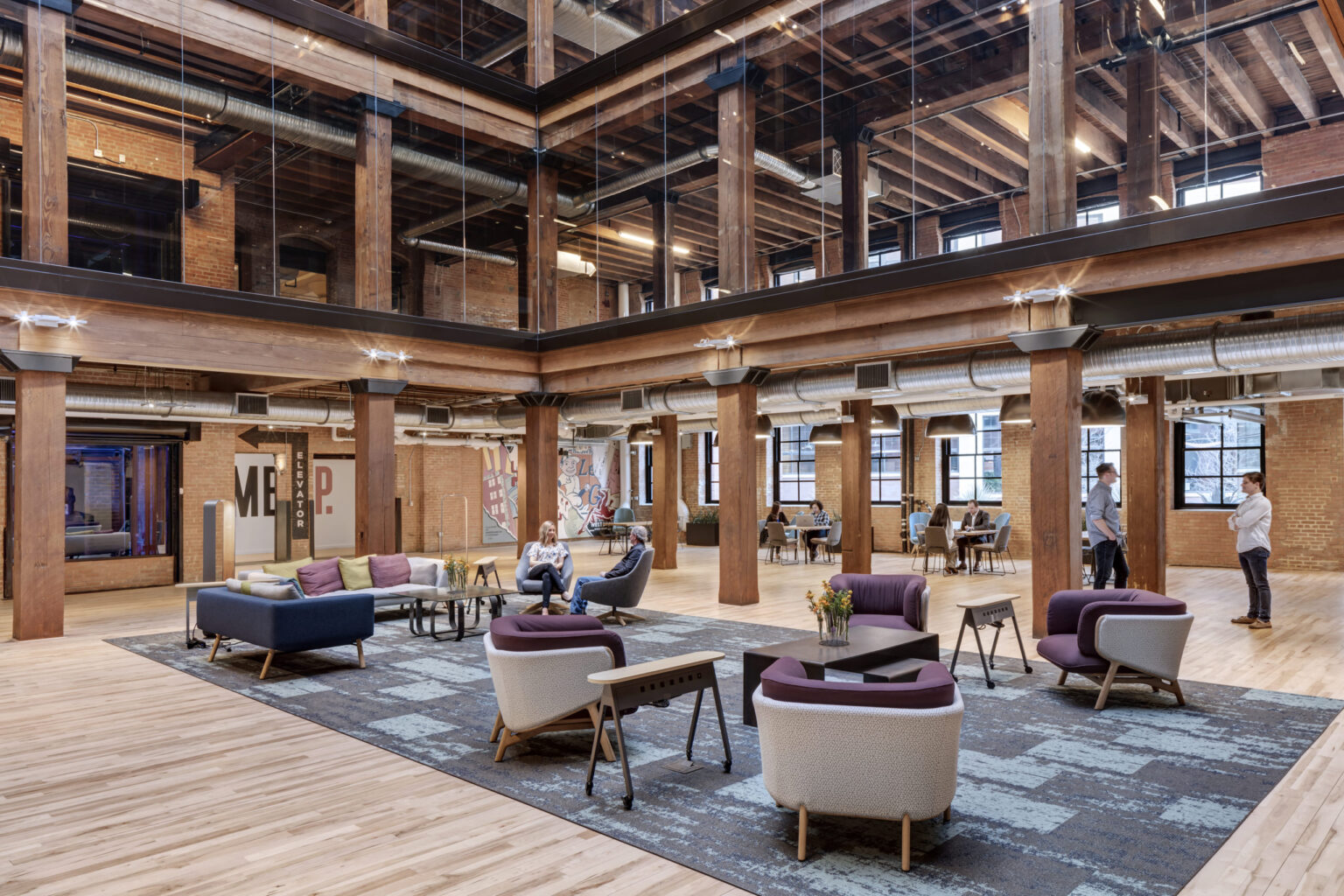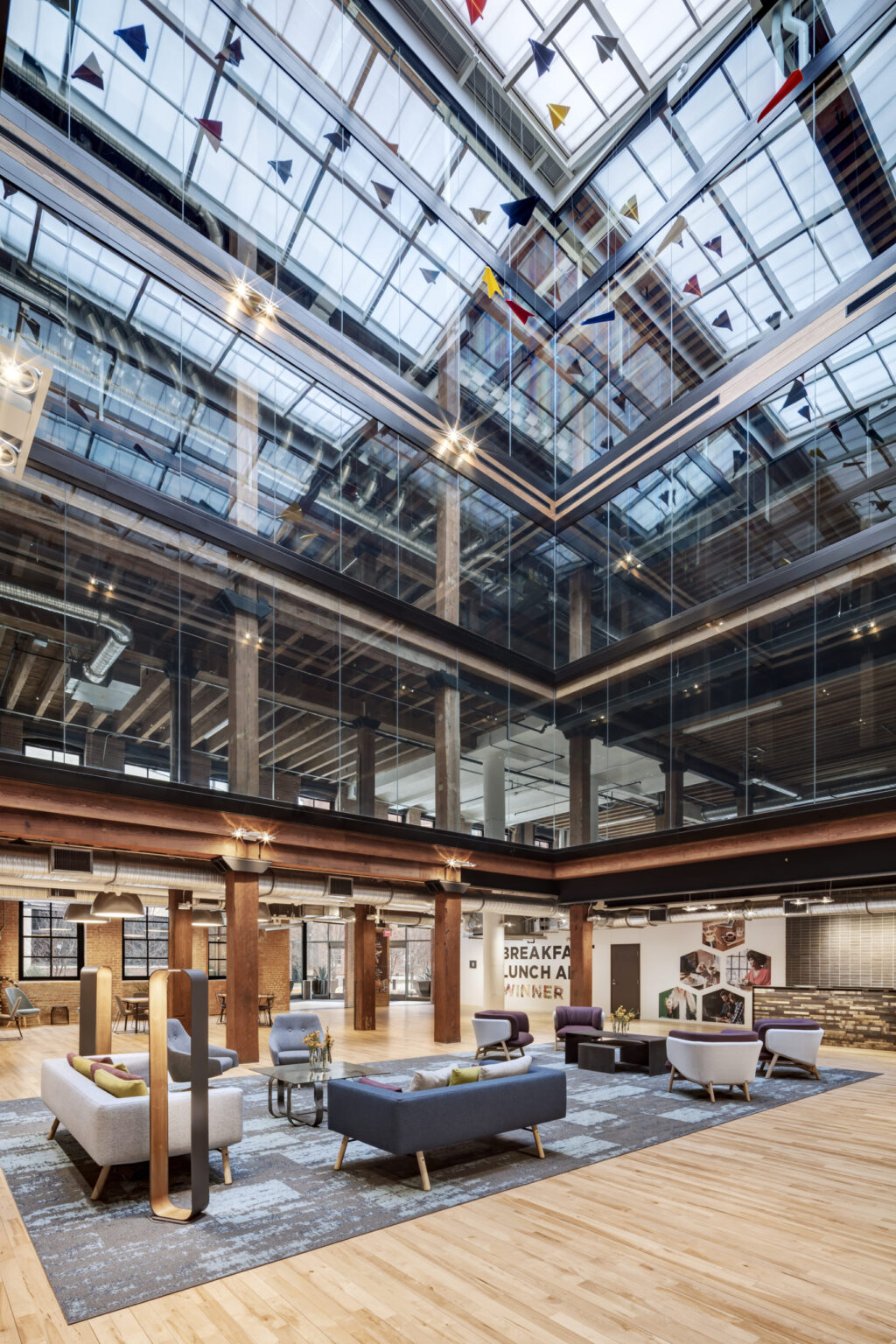 The building exhibited many scars from past uses, including a large atrium cut through the heavy-timber section and large sections of structural slabs and support columns removed to create theaters for a multiplex. The project required extensive reconstruction of missing sections of floor and supporting structure, reconstruction of the atrium to comply with current codes, and reversal and correction of unsympathetic interior modifications. Extensive exterior repairs included removing, repairing, re-glazing, and reinstalling all windows, cleaning and repointing brick masonry, and rehabilitating the historic rooftop water tanks, loading dock, and canopies.