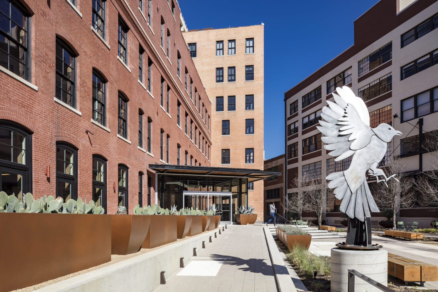 Modern additions include new plaza landscaping and primary building entry, a new skylight at the atrium, and new lease space and amenity areas created on the roofs of both the 4- and 7-story buildings. As a designated City of Dallas Landmark and listed on the National Register of Historic Places, the rehabilitation utilized City of Dallas TIF funding as well as State of Texas and federal Preservation Tax Credits.
