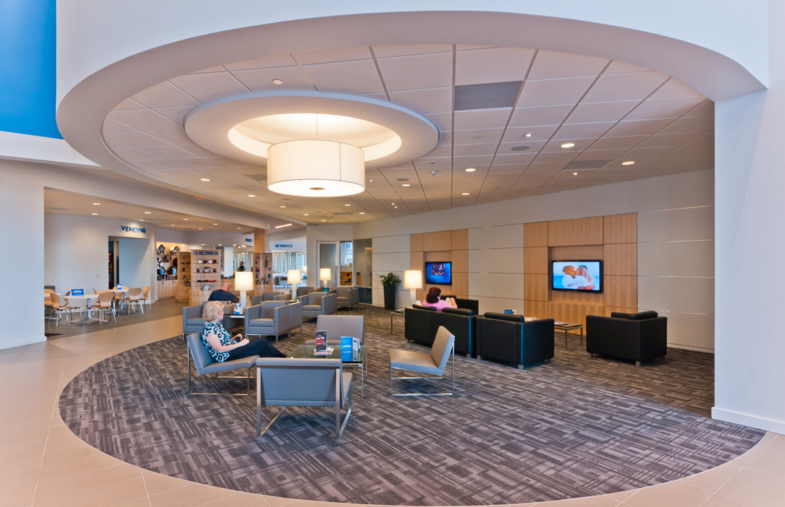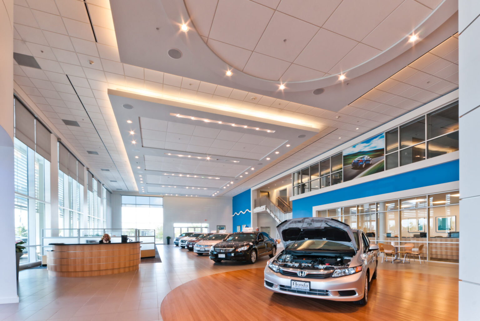 The signature Honda blue is softened by the round rotunda entrance. Natural light permeates the showroom, enhancing the signature blue wall. The client lounge features a soft, warm material palette to complement the Honda brand and create an inviting atmosphere.