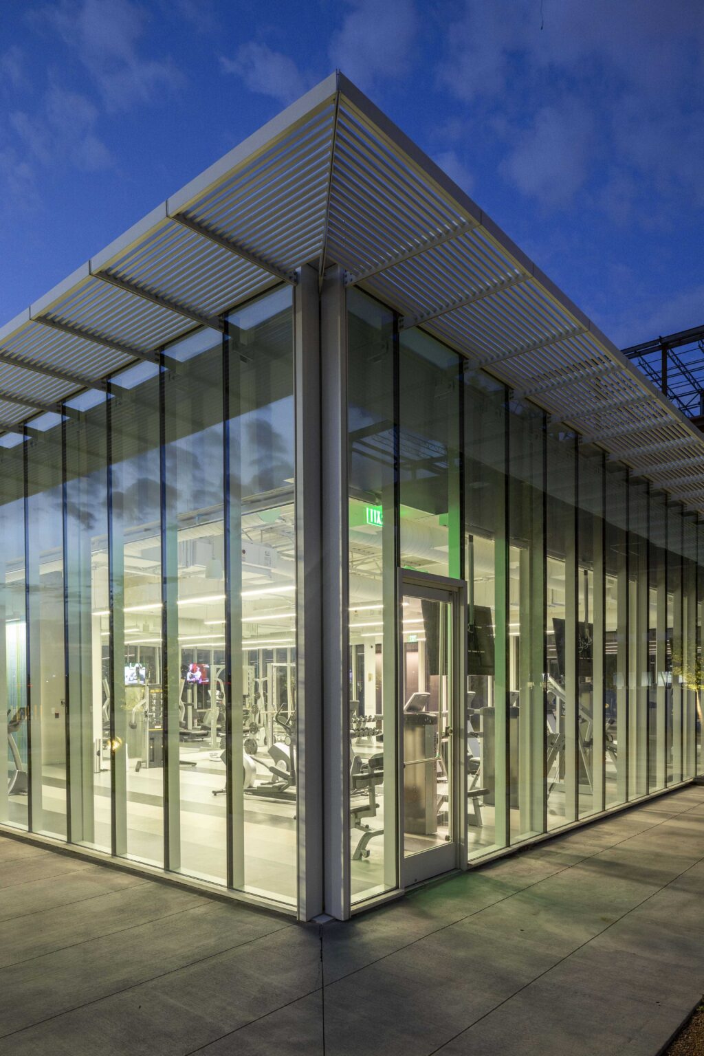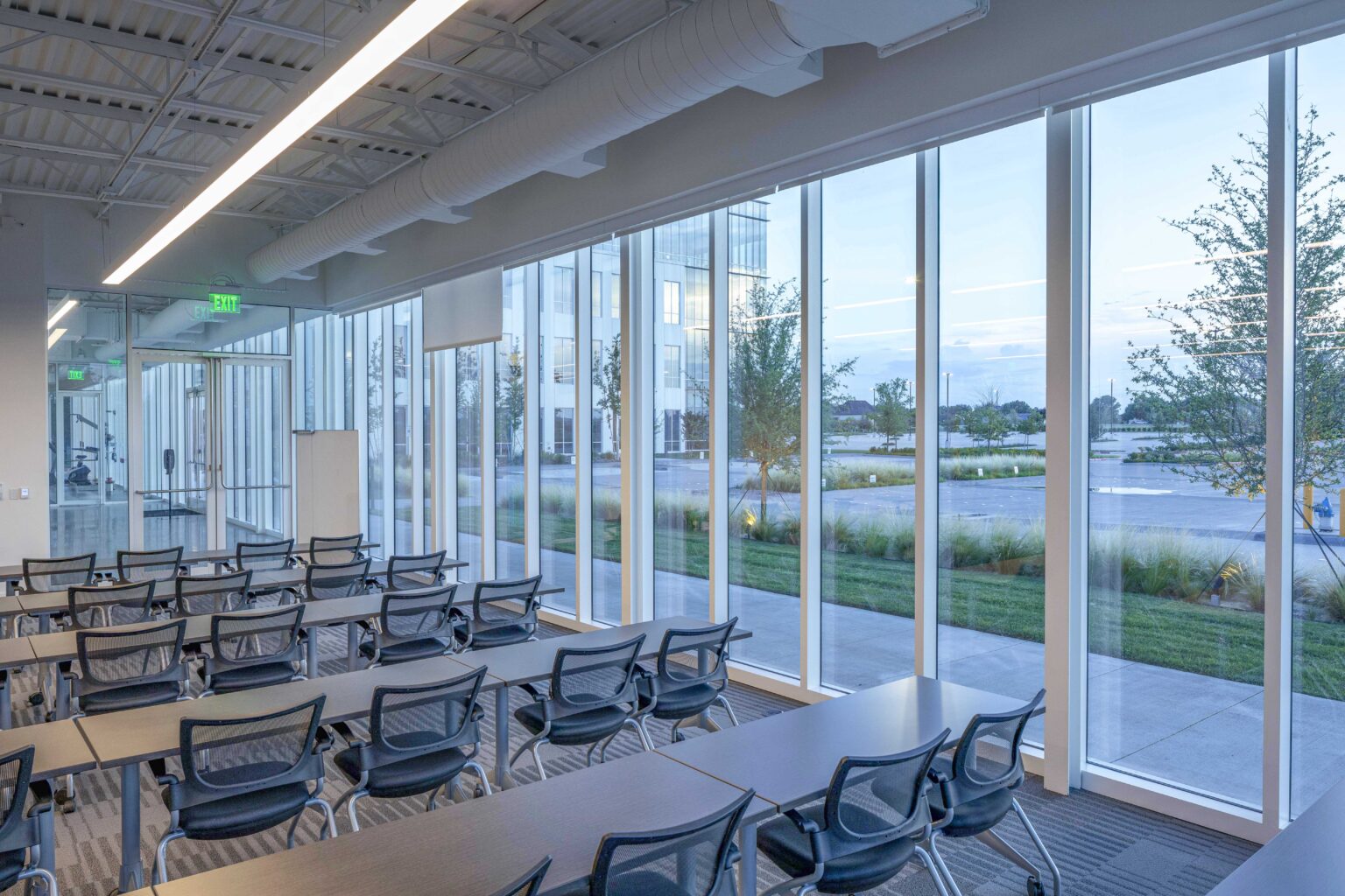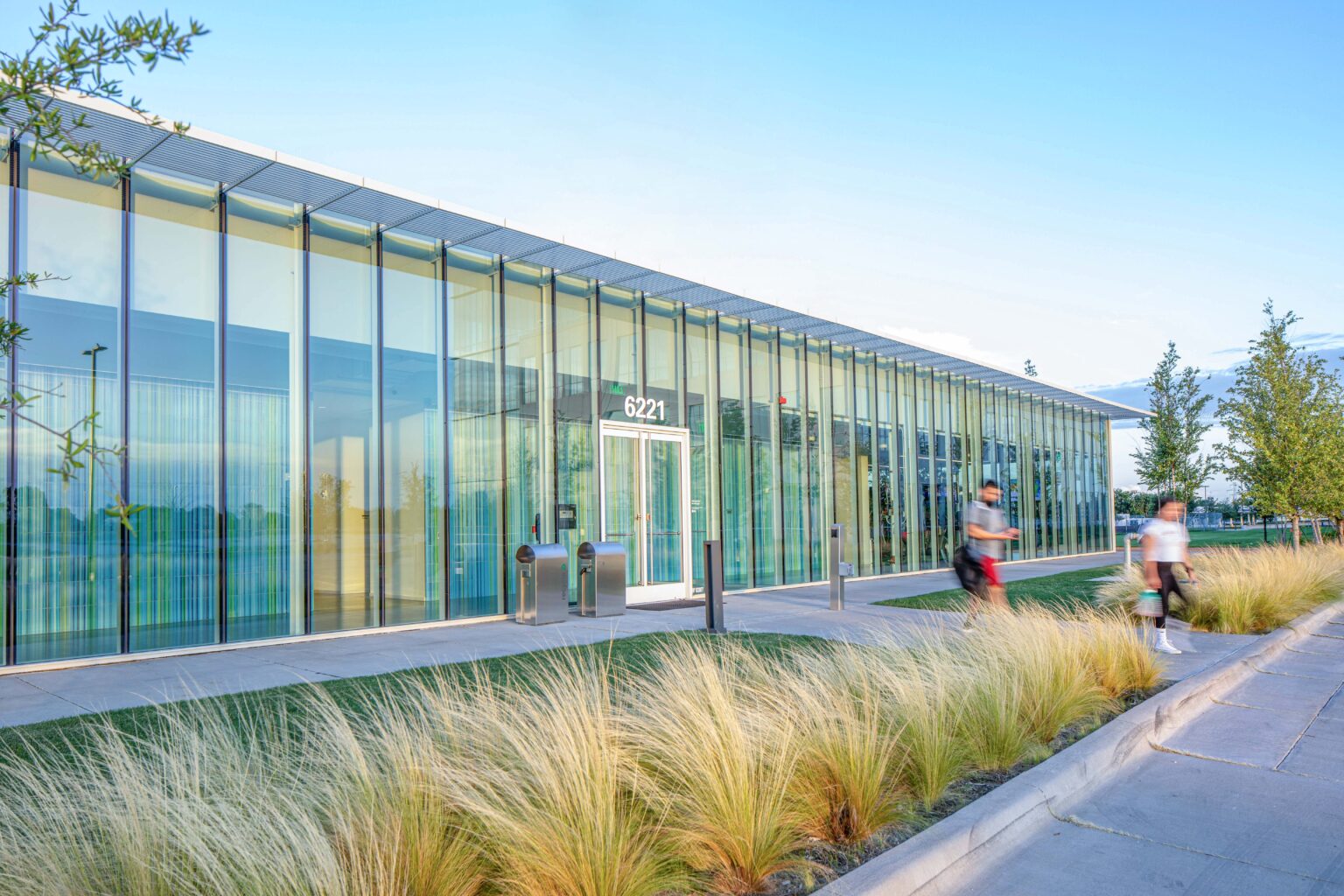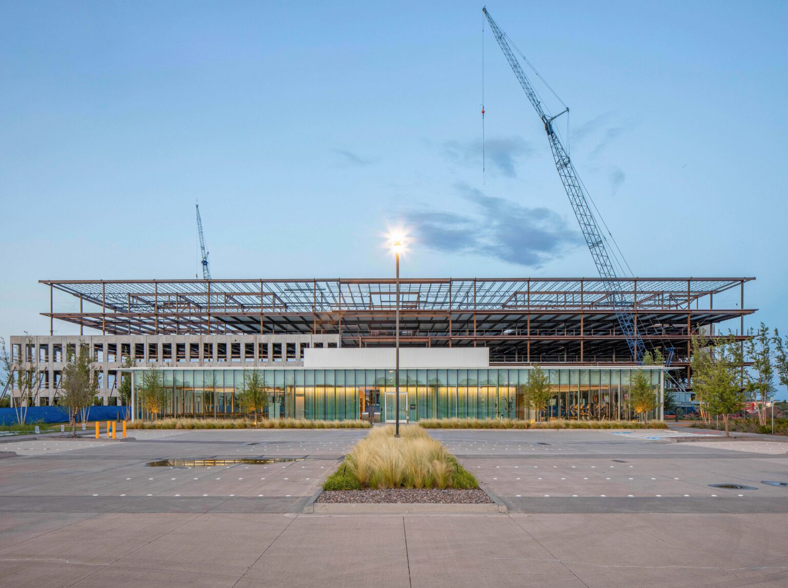 Billingsley Company hired GFF to design a 9,300 SF multipurpose pavilion which will serve the north section of the 300-acre International Business Park office campus in Plano, Texas. Daylight will infuse the building perimeter with full height glass allowing direct views to the exterior for a conference center, fitness area and a grab-and-go cafe. Composed of glass and white aluminum, and capped by a thin and elegantly detailed trellis that shades the surrounding outdoor lounge, the transparency of the pavilion and outdoor structure blurs the line between indoor and outdoor space. Situated at the intersection of several key pedestrian pathways and between four office buildings that will vary from 180,000 to 215,000 SF, the pavilion creates a focal meeting point and is surrounded by seating areas under groves of river birch. Functional spaces, such as locker rooms, form the core in the center allowing the more public uses within the building to take advantage of the perimeter views. Specially commissioned art will animate the blank wall along the west side of the building and will be visible from the processional motor court.