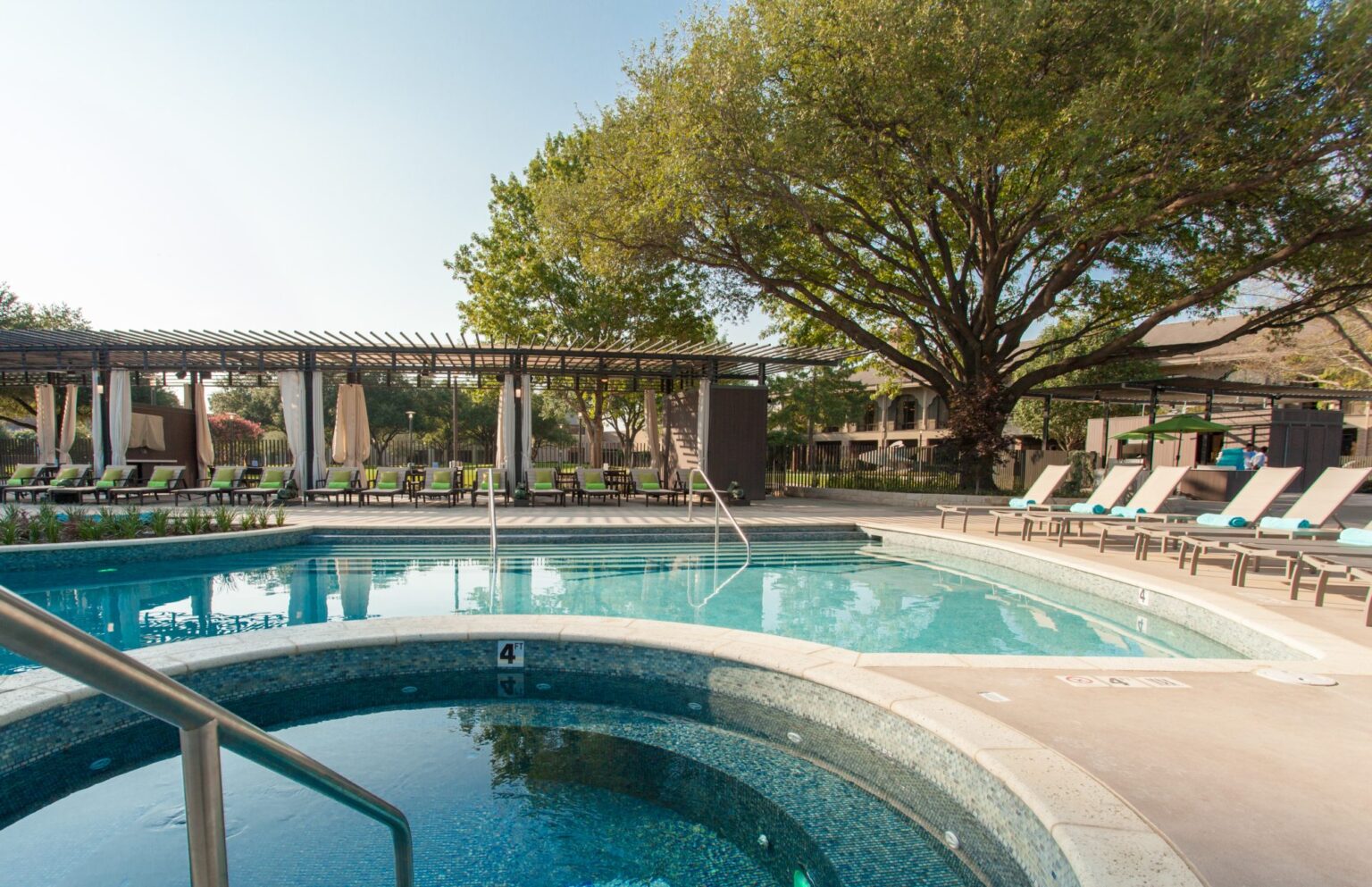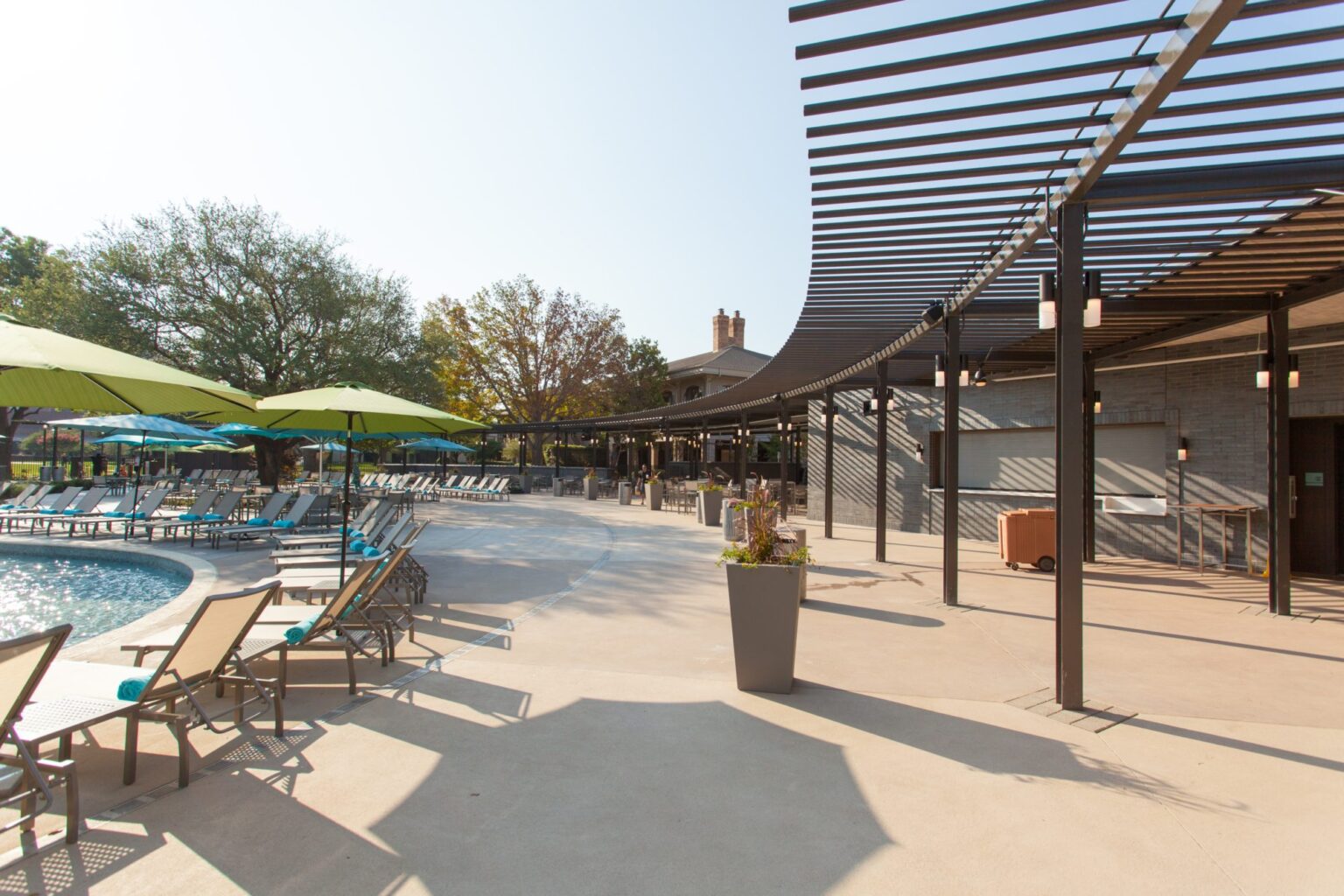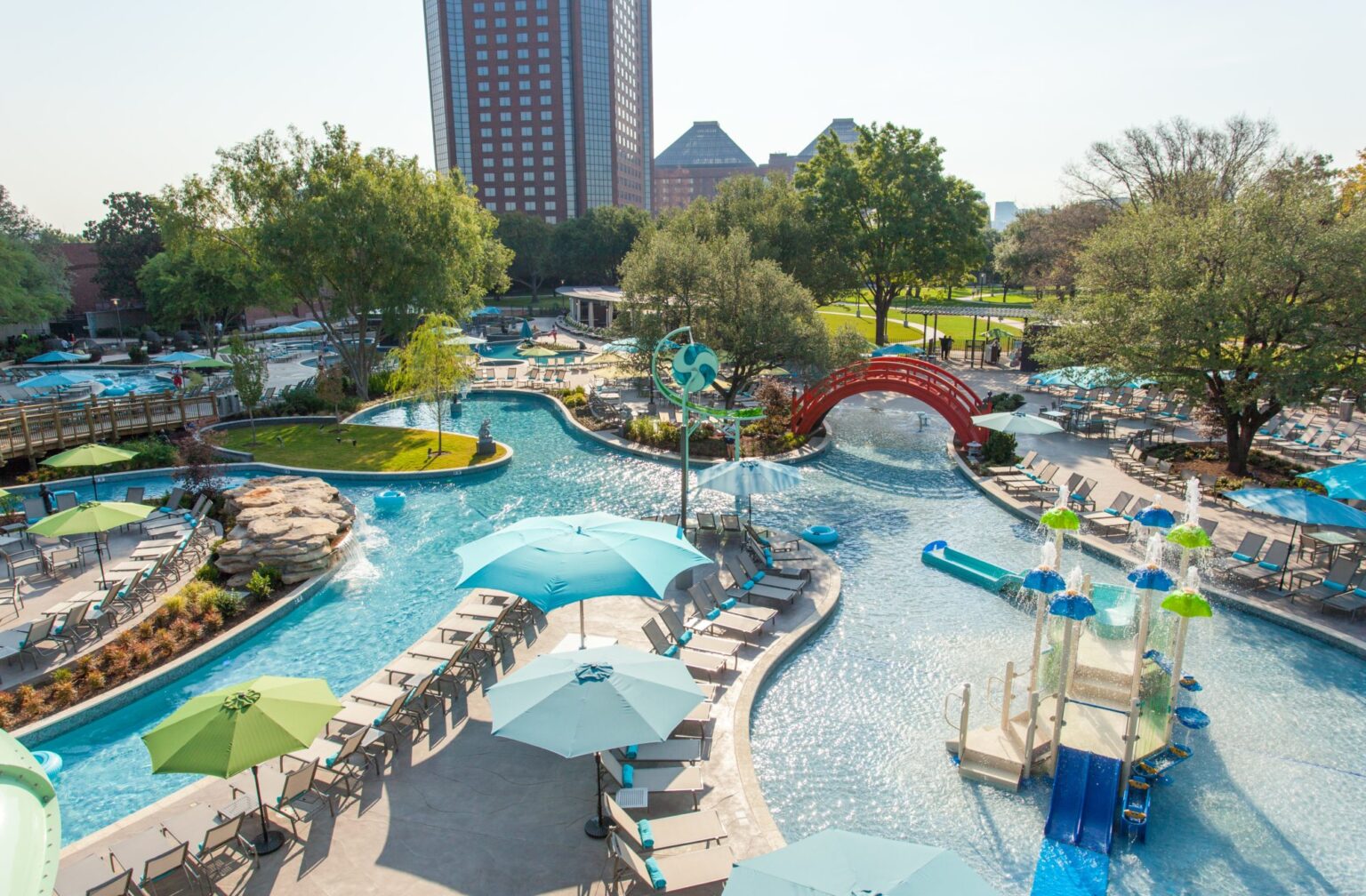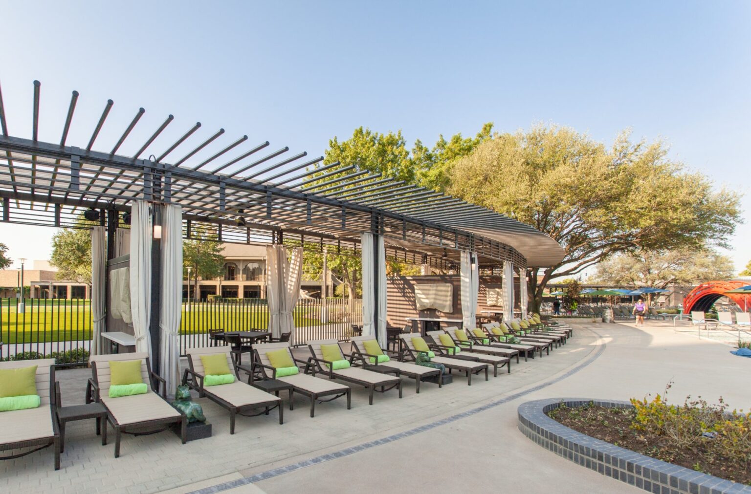 Since 1983, the Hilton Anatole Hotel has been one of the largest hotels in the American South. With over 1,600 rooms and numerous convention-based gathering spaces, it has remained one of Dallas’ most prized destinations. In 2014, the Hilton Anatole embarked on a $25 million endeavor to transform the existing 4-acre courtyard into a water park amenity for hotel guests, aiming to engage a more family-oriented market. GFF provided design services for four unique yet consistent structures: a 15,000-square-foot multiuse walk-up bar and grill structure, restrooms and lockers, a 400-square-foot entry pavilion for guest check-in, a 2,000-square-foot cabana structure for guest rental, and a 700-square-foot swim-up bar as part of an adult-oriented leisure pool.