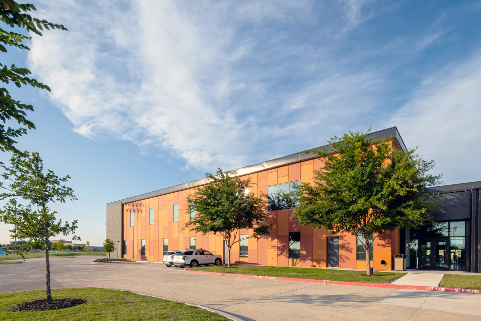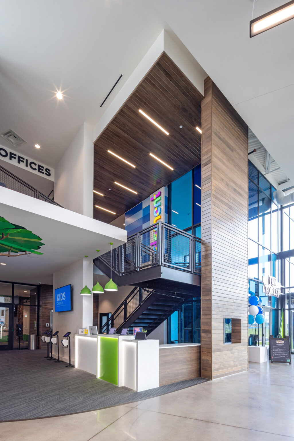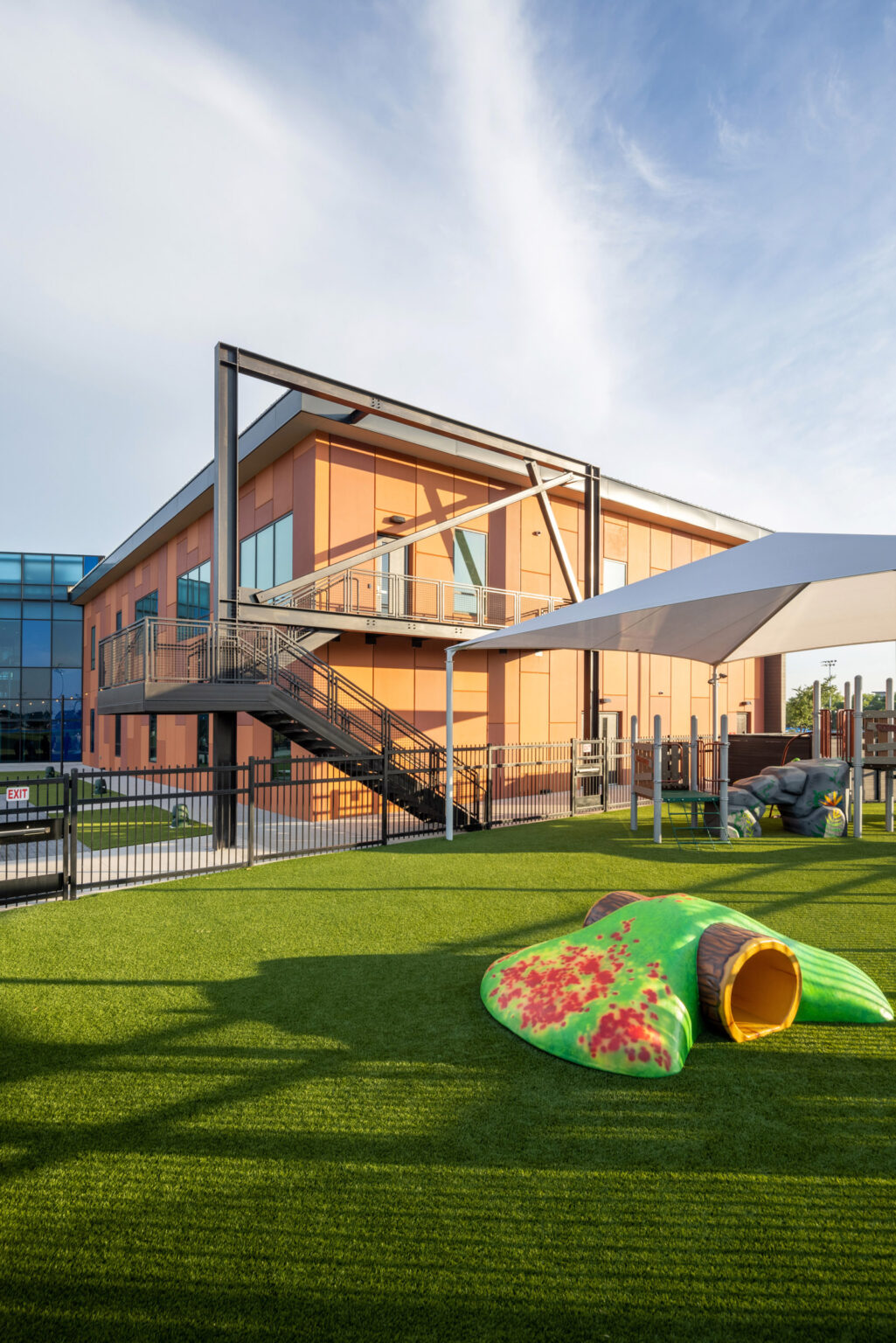 The two-story children’s addition features concrete tilt-up panels with a reveal pattern and color palette that complement the existing facility. A secondary exit stair, constructed with a steel frame and featuring an abstract cross design, serves the second floor of the addition.Â
