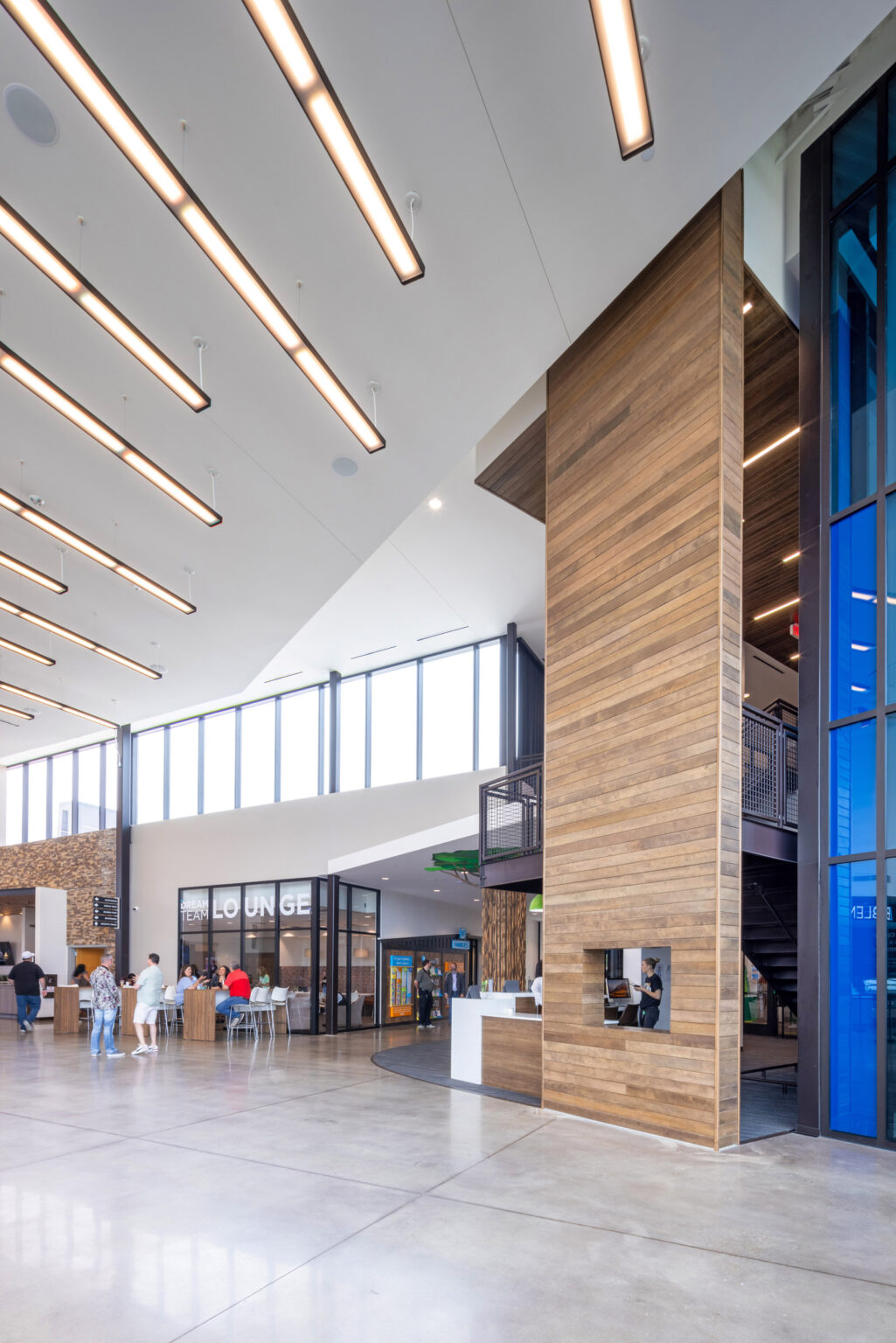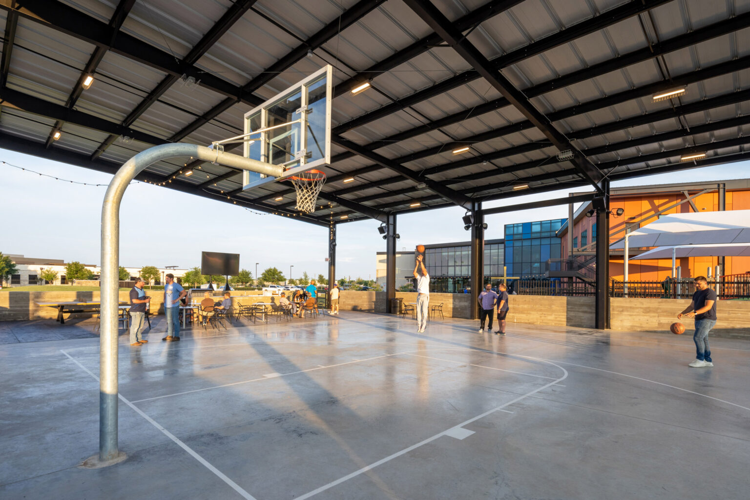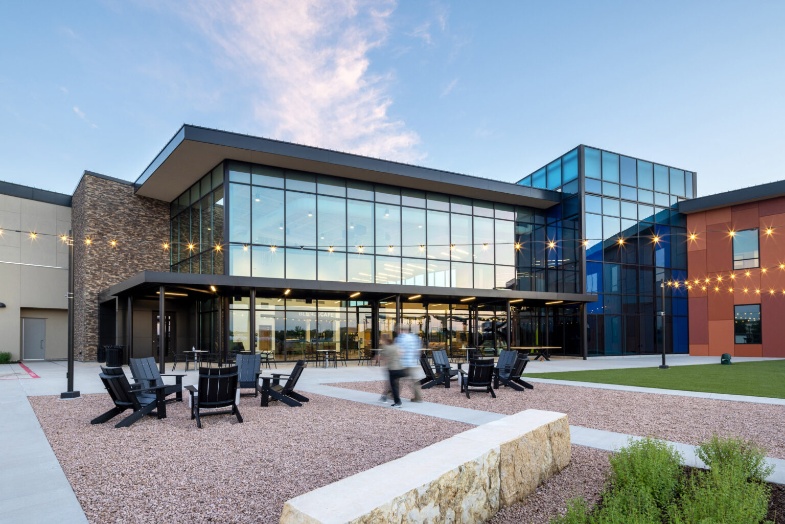Outdoor amenities further enhance the site, including a covered terrace with seating areas, an outdoor baptistry that doubles as a water feature, a fire pit, a pavilion with a basketball court, an open lawn for movies and events, and an outdoor kitchen. Additionally, regrading the site created surplus soil, which was shaped into an informal outdoor amphitheater for worship, movies, and live performances.Â