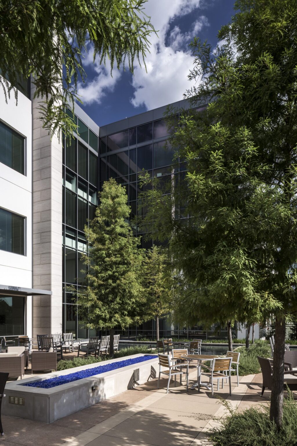GFF was hired for architectural and interior design services for the new MedAssets corporate headquarters located in Plano. The design intent for this four-story, tilt wall, 230,000 SF building was to create a clean and modern shell building with a two-story lobby that offers views to both the east and the west. The fourth floor continuous window wall looks out onto the various campus amenities including a reflecting pool, jogging trail, sand volleyball court, half basketball court and outdoor dining. A fitness and wellness center are also included. The campus also includes surface parking for more than 1,100 cars and a pedestrian connection to Legacy Town Center. The site plan was designed to accommodate a future wing that could add another 120,000 SF as well as a parking garage.