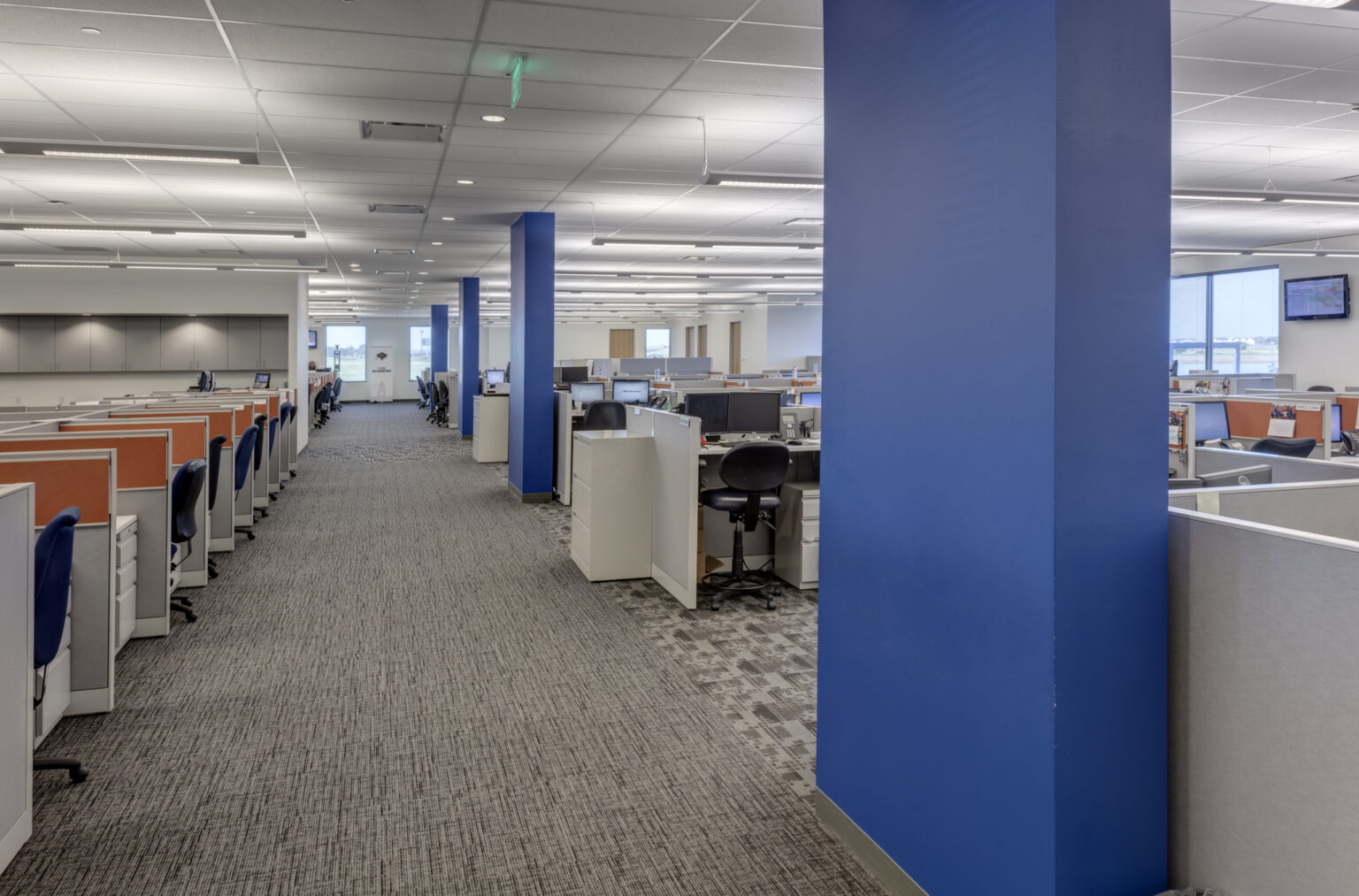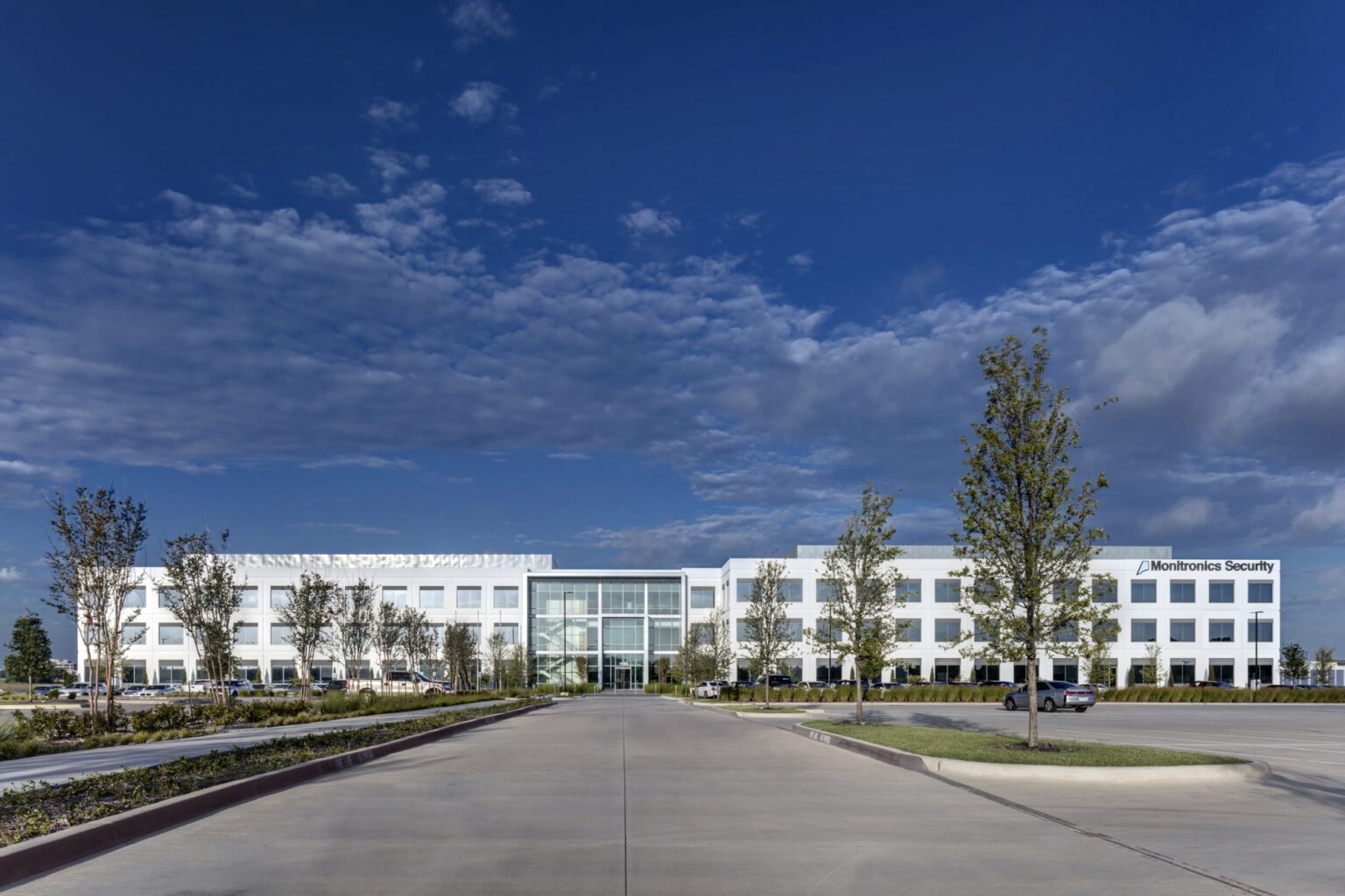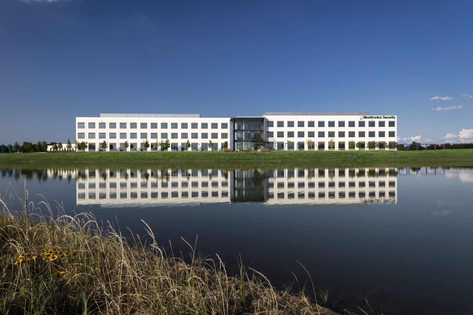 The new national headquarters for Monitronics is a 3-story 165,000SF build-to-suit facility in Billingsley Company’s Mercer Crossing Business Park. The building, also developed by Billingsley, includes a 24/7 operations center and numerous amenities for Monitronics’ 1,300 employees. GFF provided master planning, architectural, interior design and landscape architectural services. The master plan includes three buildings with a central park featuring a large scale sculpture anchoring the development. A hike and bike trail hugs the lake and connects to a trail network extending west. The trail is flanked with a series of trees and art gateways that create a sense of place at each transition. The Monitronics site is approximately 15.5 acres and accommodates an 8 per 1,000 SF parking ratio due to shift overlaps in their 24-hour/day alarm monitoring operation. The building sits along the lake edge to maximize water views and highway visibility. The lakeside setting influenced the linear configuration of the building. The offset wings articulate the main entrance, marked by a composite metal frame and large expanse of glass that includes the lobby and a stair, making the main entry plaza more dynamic. The painted concrete wall utilizes a precise rhythm of windows within a master grid that threads through the window.