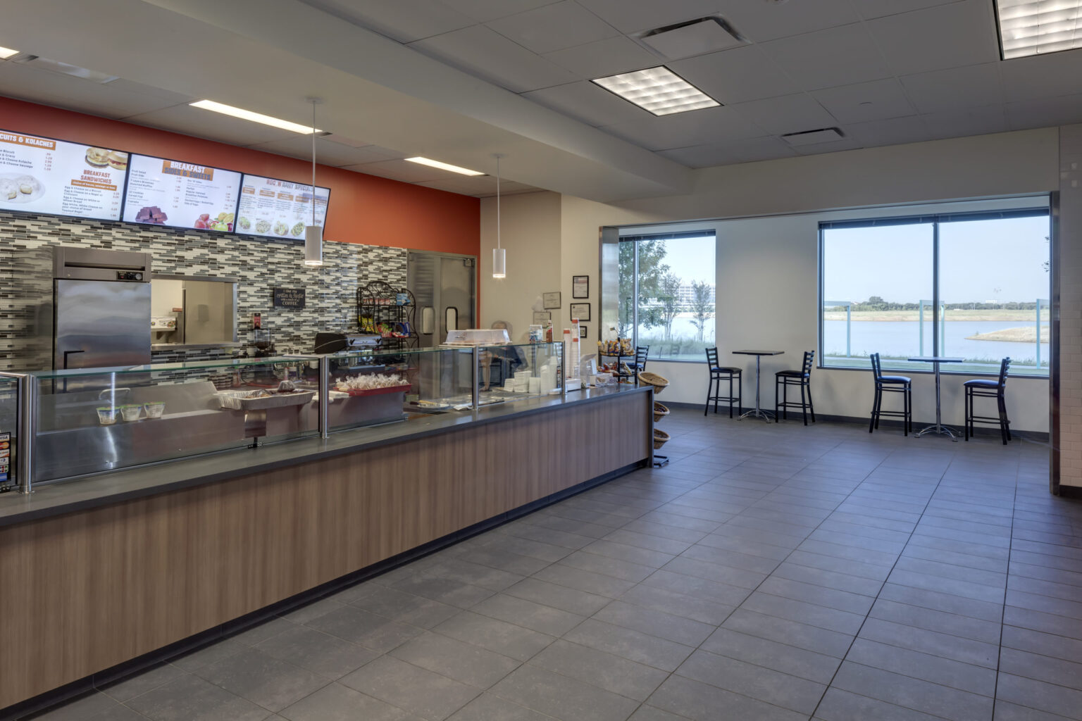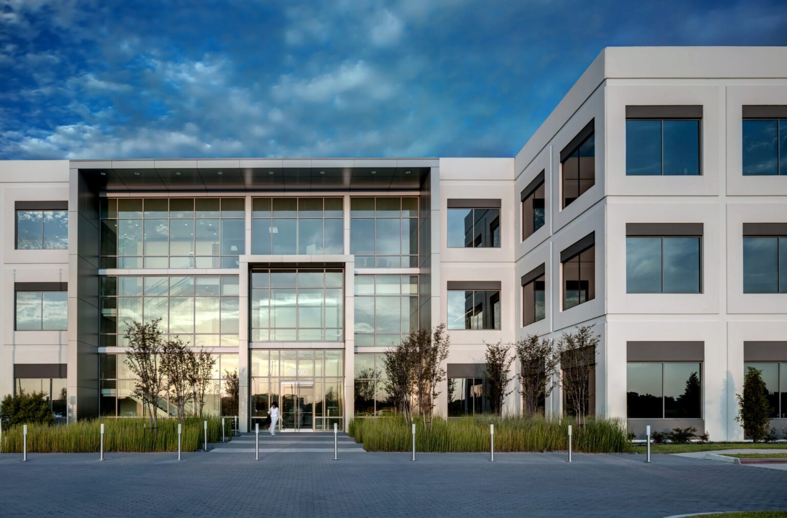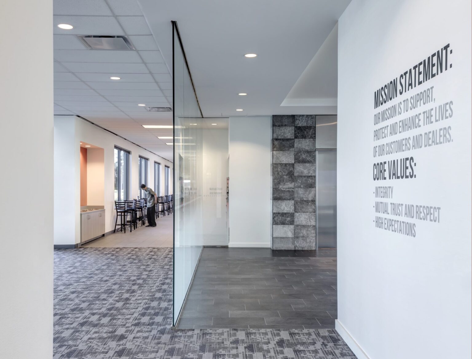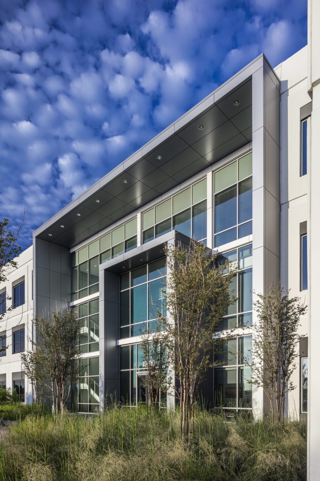The new national headquarters for Monitronics is a 3-story 165,000SF build-to-suit facility in Billingsley Company’s Mercer Crossing Business Park. The building, also developed by Billingsley, includes a 24/7 operations center and numerous amenities for Monitronics’ 1,300 employees. GFF provided master planning, architectural, interior design and landscape architectural services. The master plan includes three buildings with a central park featuring a large scale sculpture anchoring the development. A hike and bike trail hugs the lake and connects to a trail network extending west. The trail is flanked with a series of trees and art gateways that create a sense of place at each transition. The Monitronics site is approximately 15.5 acres and accommodates an 8 per 1,000 SF parking ratio due to shift overlaps in their 24-hour/day alarm monitoring operation. The building sits along the lake edge to maximize water views and highway visibility. The lakeside setting influenced the linear configuration of the building. The offset wings articulate the main entrance, marked by a composite metal frame and large expanse of glass that includes the lobby and a stair, making the main entry plaza more dynamic. The painted concrete wall utilizes a precise rhythm of windows within a master grid that threads through the window.