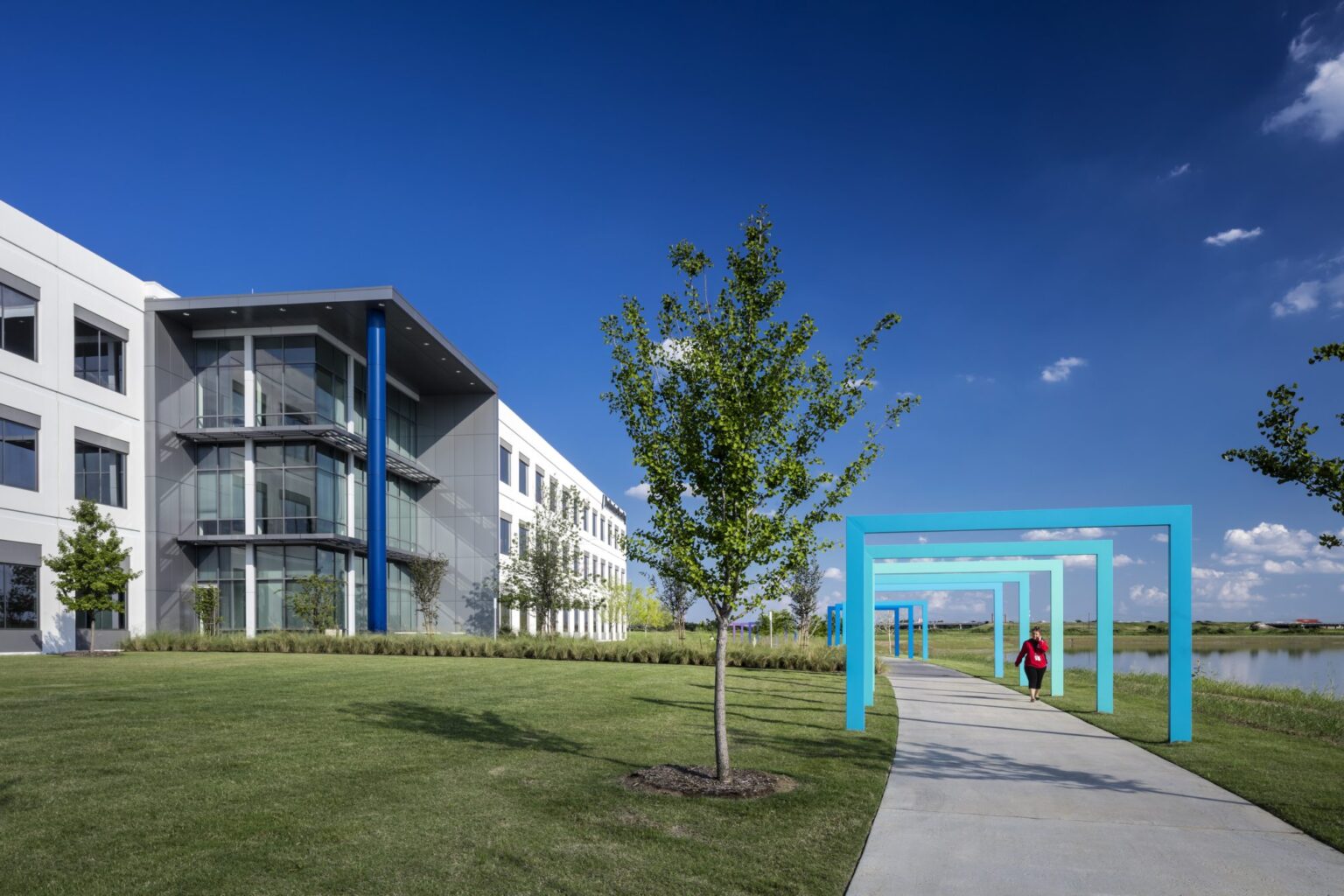 The campus master plan includes three buildings arranged around a central park anchored by a large-scale sculpture, creating a distinctive sense of place