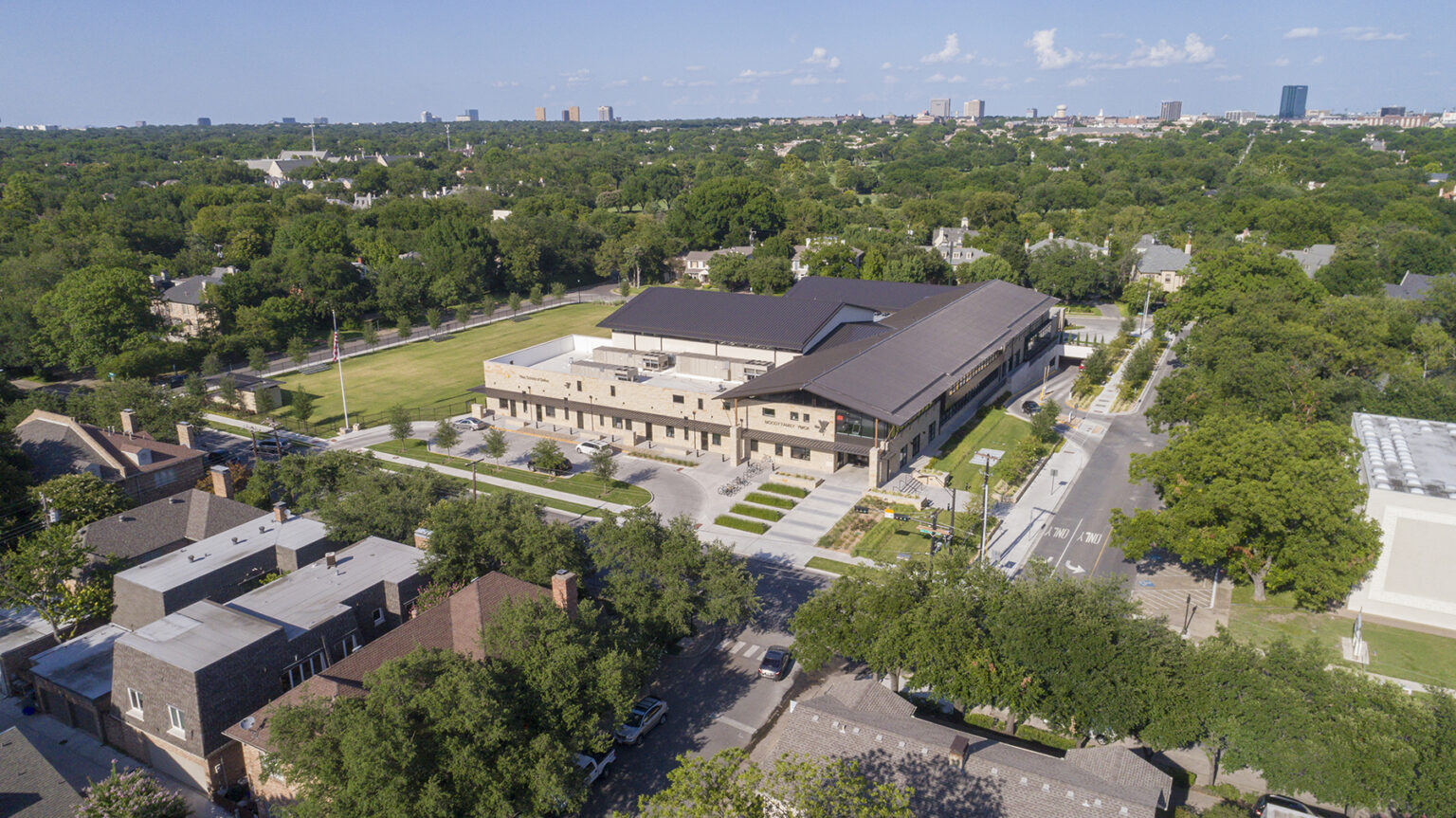 The new state-of-the-art facility includes a 284-car underground parking garage, covering the entire site to remove cars from neighboring streets and serve visitors, staff, and the adjacent Unitarian Church during Sunday services. The building features a prominent public entry on Preston Road while maintaining a residential scale through the use of gable roofs, porches, covered walkways, and compatible building materials.