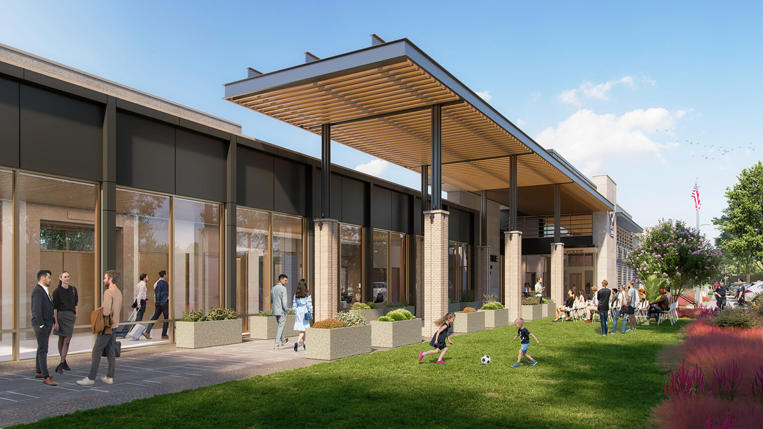 The new police headquarters provides ample space for the entire department, featuring significant safety and security upgrades from their previous facility. A new Emergency Operations Center doubles as a storm shelter for staff during severe weather events. The dispatch suite within the new facility offers ample daylight and wellness amenities for staff use. Indoor and outdoor fitness spaces promote regular exercise, while staff break rooms and outdoor plazas encourage camaraderie and team building, balancing the high-pressure nature of law enforcement.