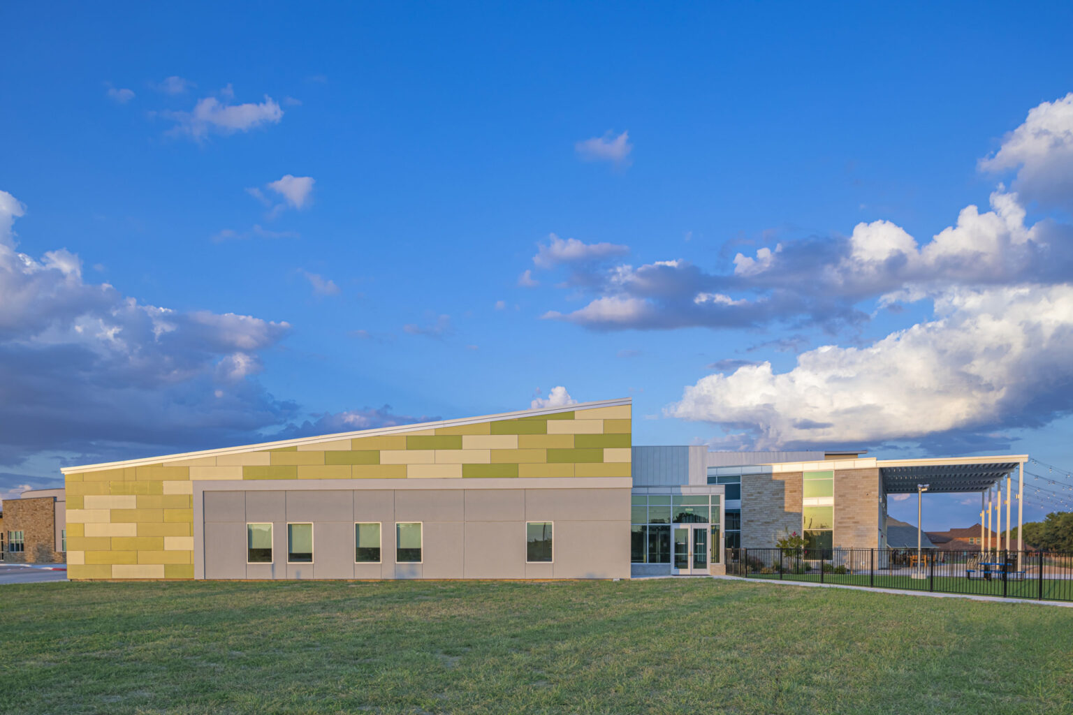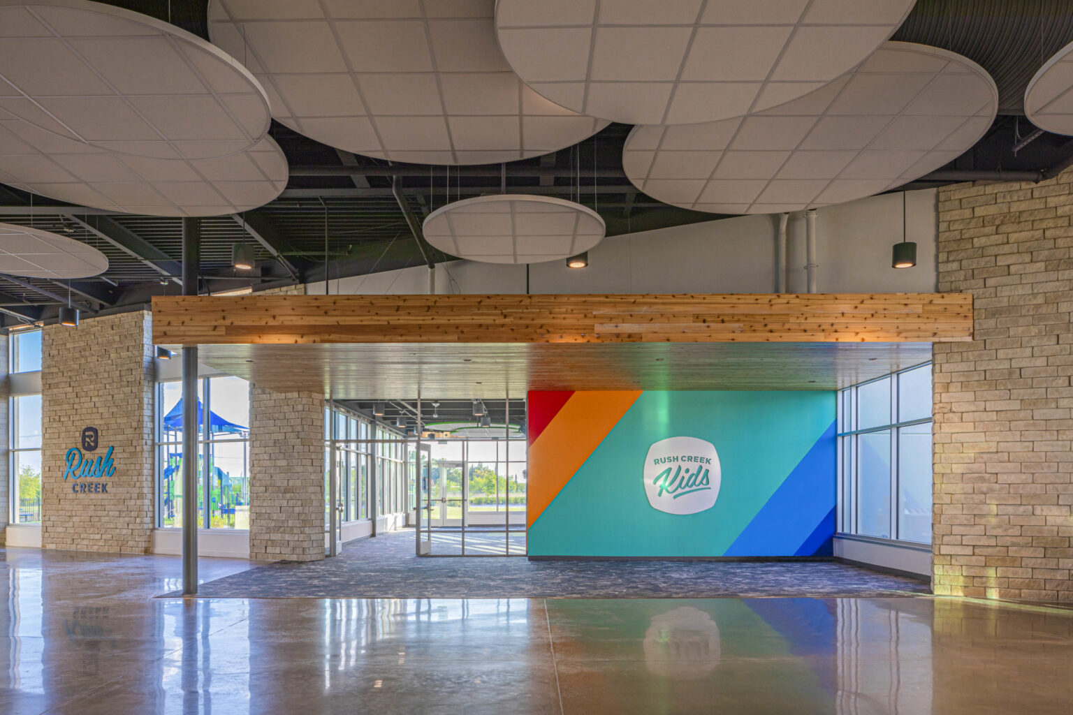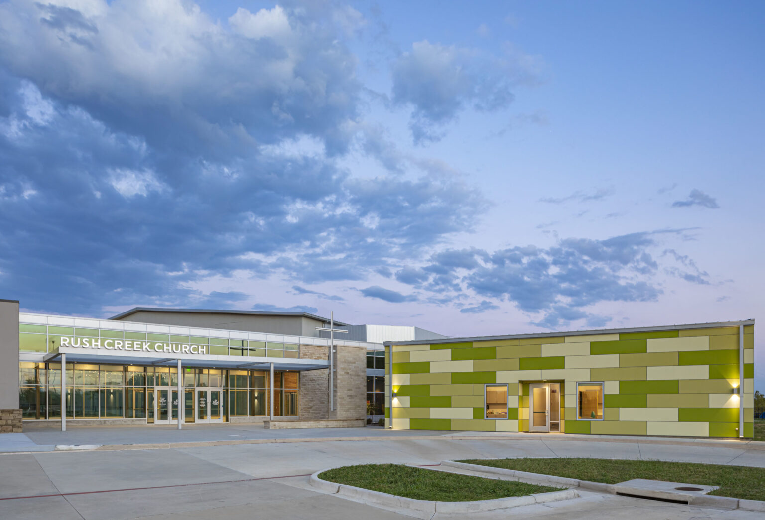 The Church on Rush Creek engaged GFF to update the Master Plan for their Mira Lagos campus, which serves the Grand Prairie and Mansfield communities. The first phase involved extending the existing common gathering area to connect additional children’s classrooms and a new 750-seat Worship Center. The design features vibrant fiber cement paneling combined with natural materials such as stone and wood cladding, inspired by the surrounding site adjacent to Joe Pool Lake.