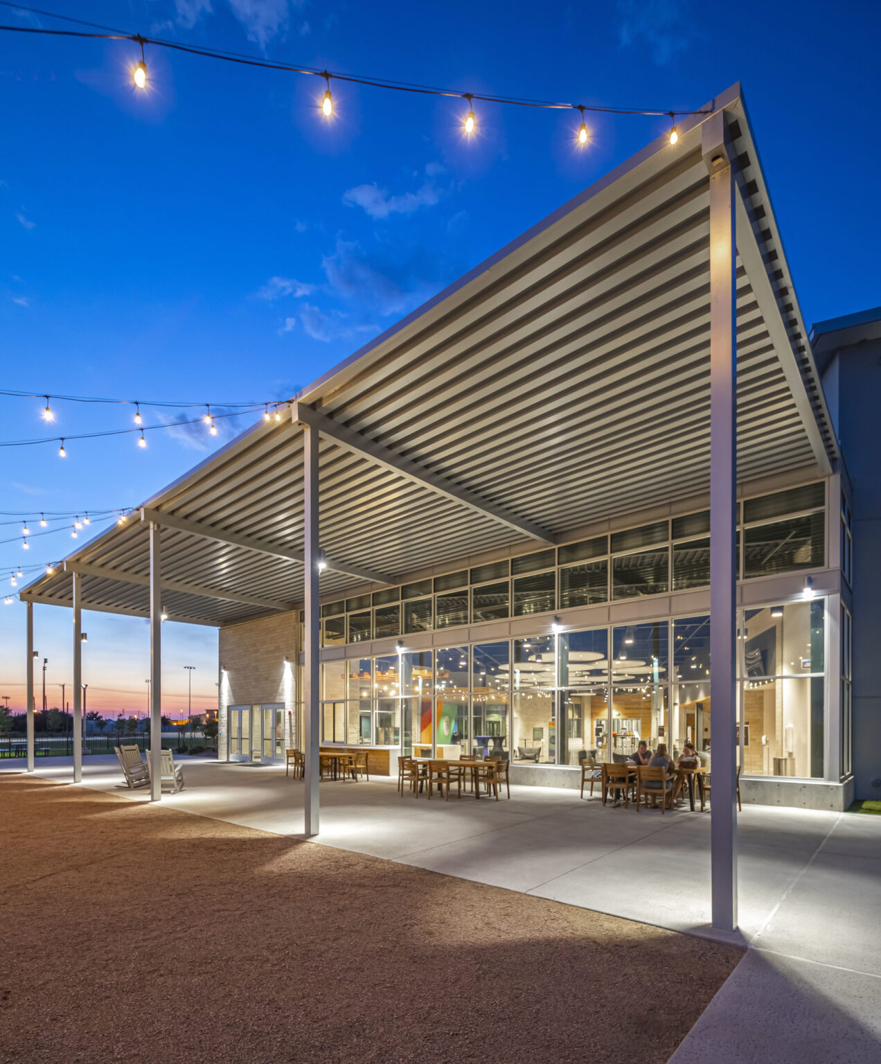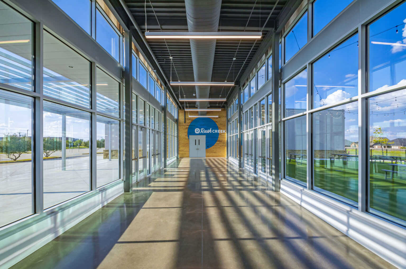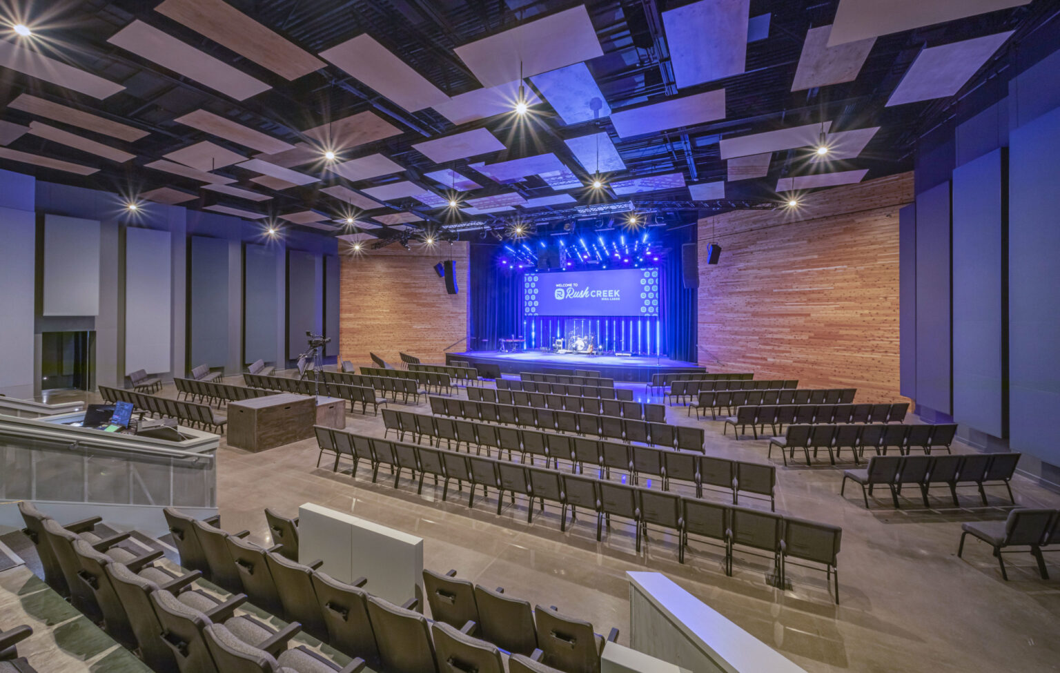 The Church on Rush Creek engaged GFF to update the Master Plan for their Mira Lagos campus, which serves the Grand Prairie and Mansfield communities. The first phase involved extending the existing common gathering area to connect additional children’s classrooms and a new 750-seat Worship Center. The design features vibrant fiber cement paneling combined with natural materials such as stone and wood cladding, inspired by the surrounding site adjacent to Joe Pool Lake.