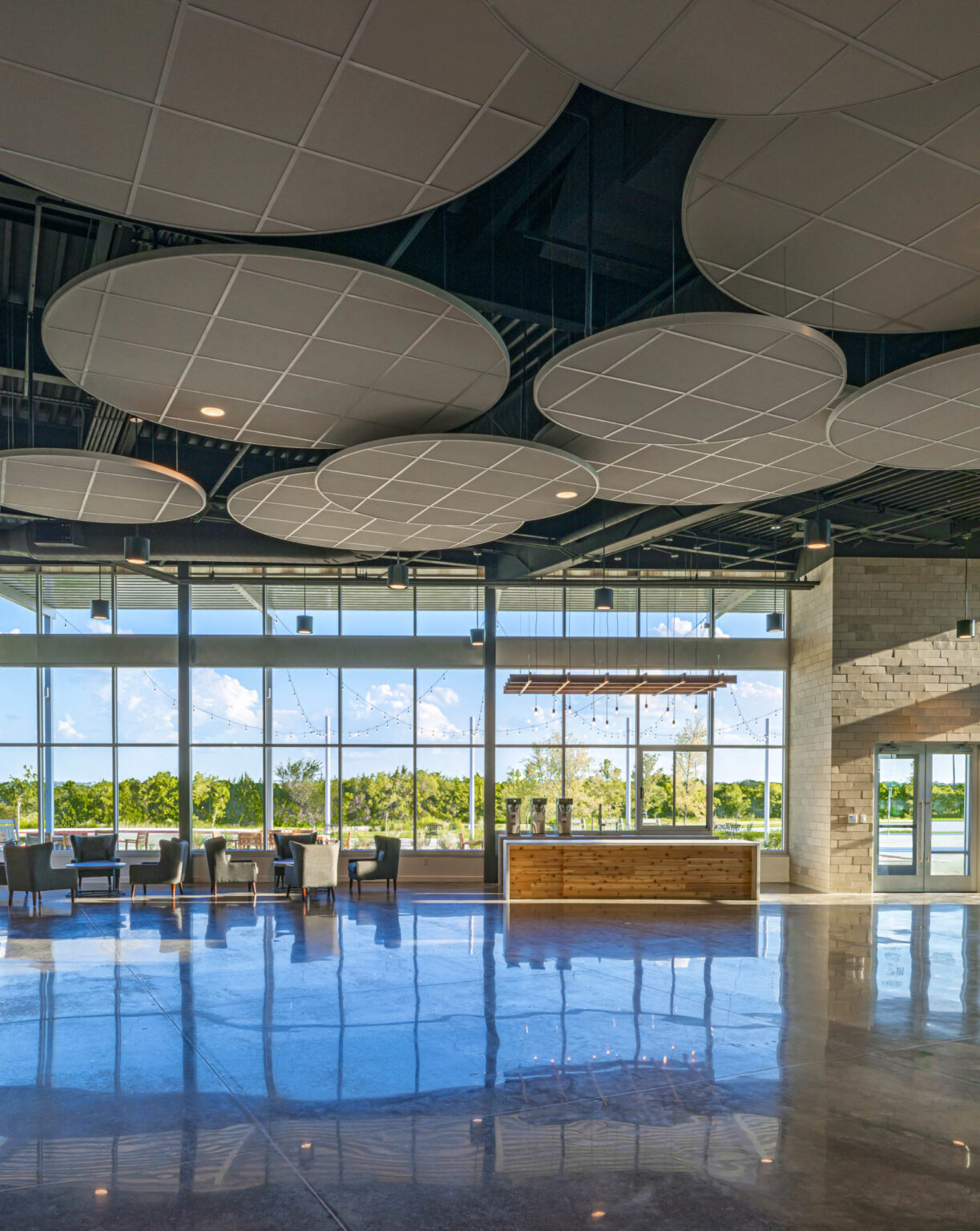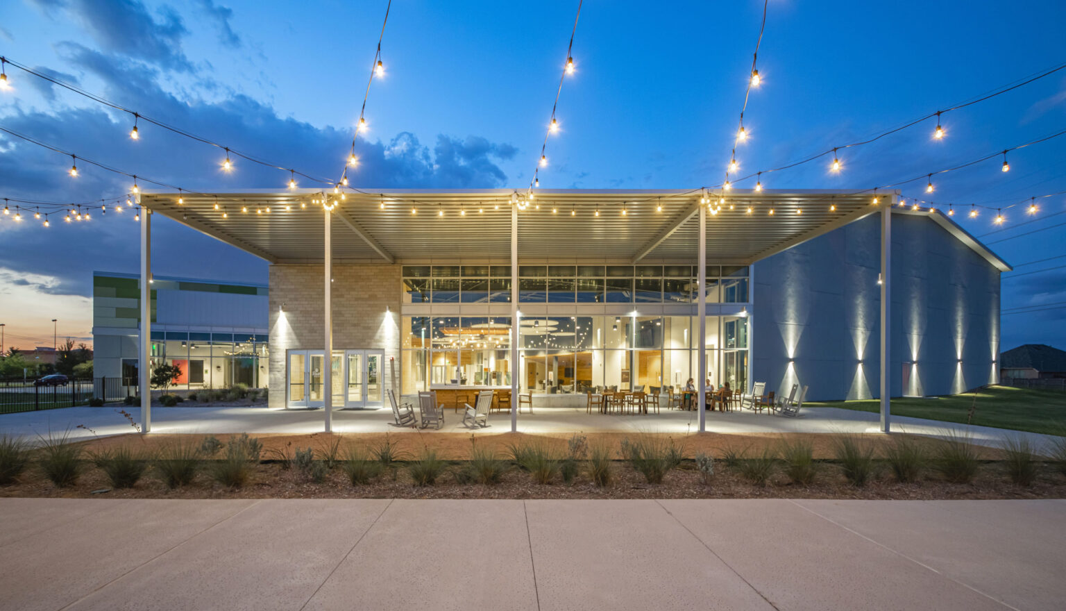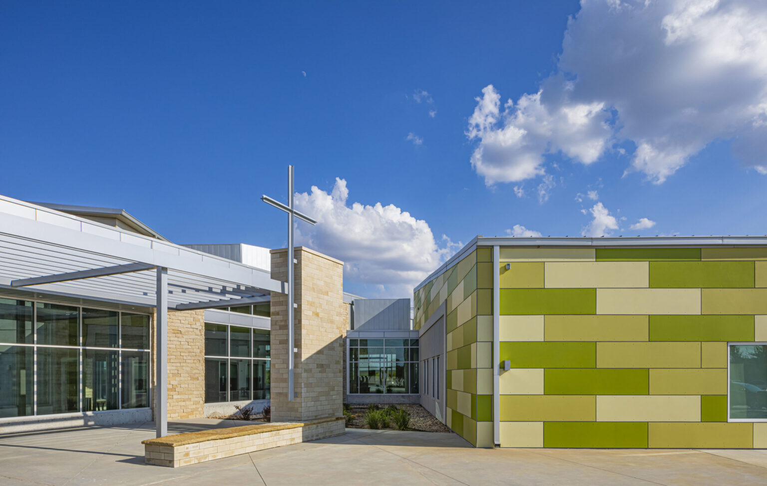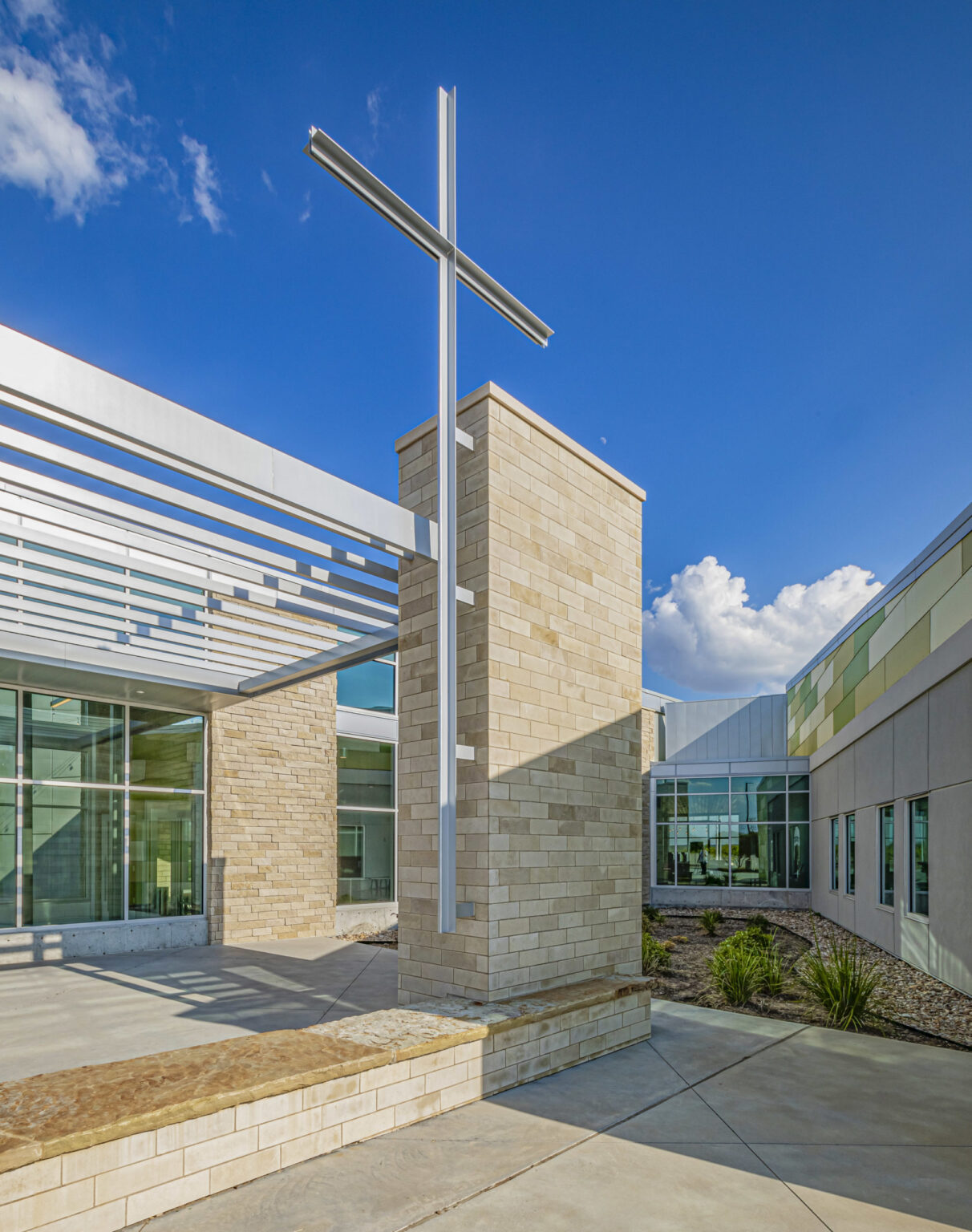 The newly expanded common area offers space for families to gather before and after services and throughout the week. The exterior materials extend into the interior to create a seamless connection to the outdoors. Landscaped patios and nature trails provide congregants with additional opportunities to enjoy the campus amenities, both inside and out.