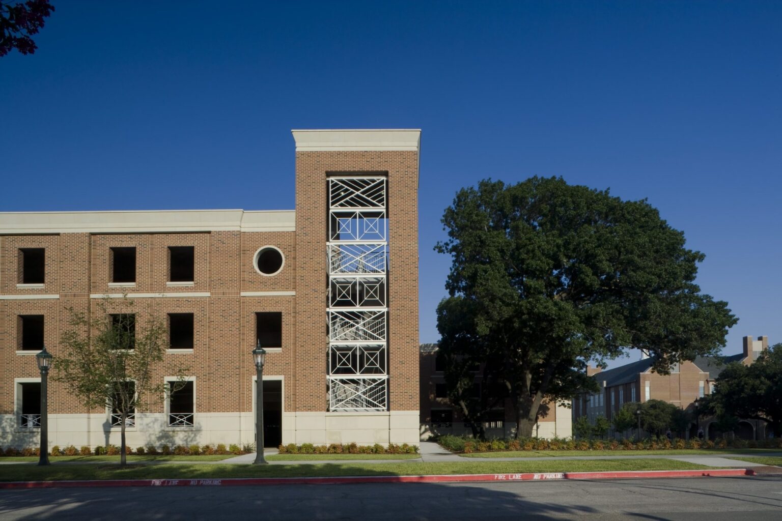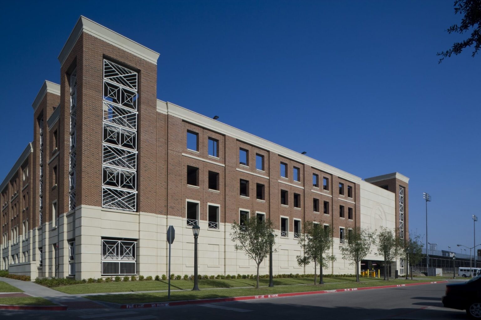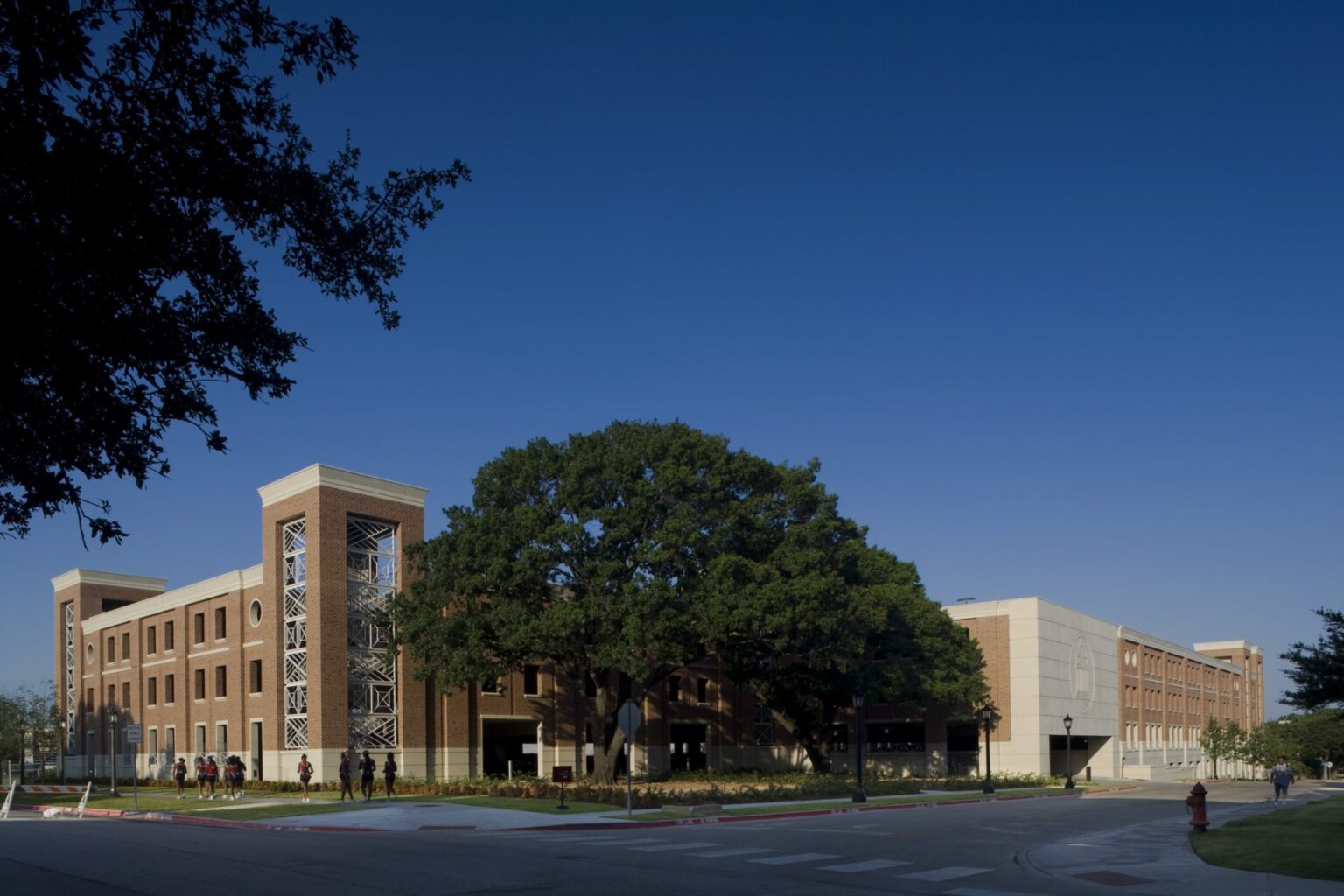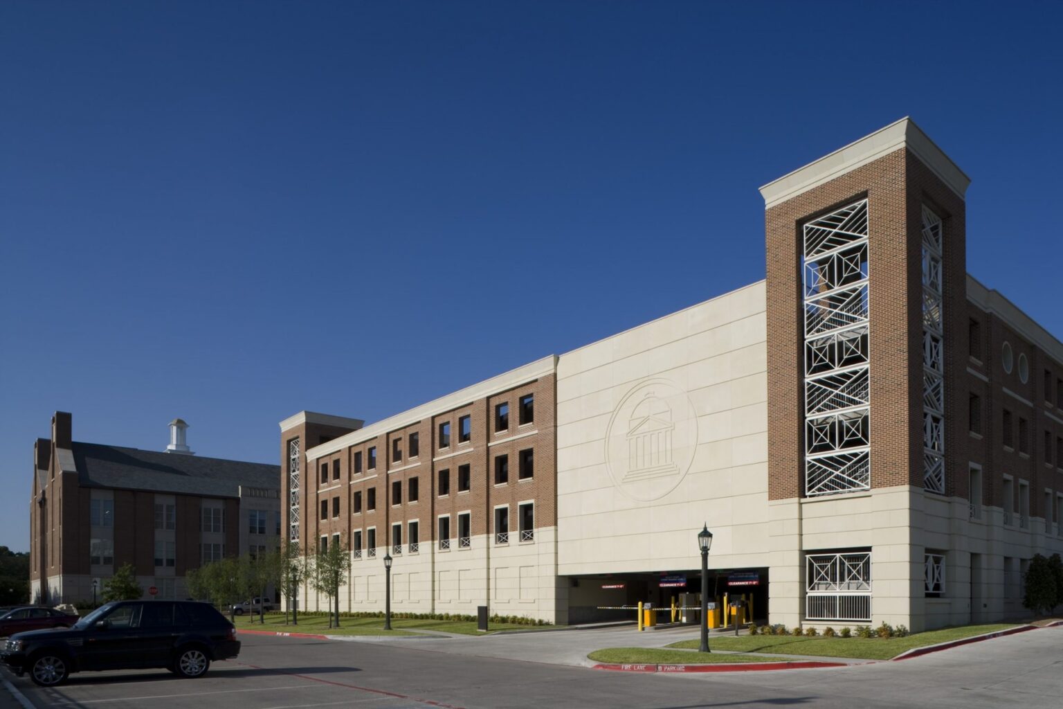 GFF designed a new five-story, 854-car garage to serve the southern end of the Southern Methodist University campus. As an outgrowth of the Centennial Master Plan, which GFF authored, parking garages located on the periphery of the campus help reinforce the pedestrian character and generally beautify the campus by converting asphalt to green space. The 326,500 square foot garage will serve the new East Quad, Moody Coliseum, and athletic venues to the south, most notably Ford Stadium and Westcott Field. The garage cost $13,380,000, or approximately $15,670 per space. It is compatible with the collegiate Georgian style of the campus and was completed in April 2008.