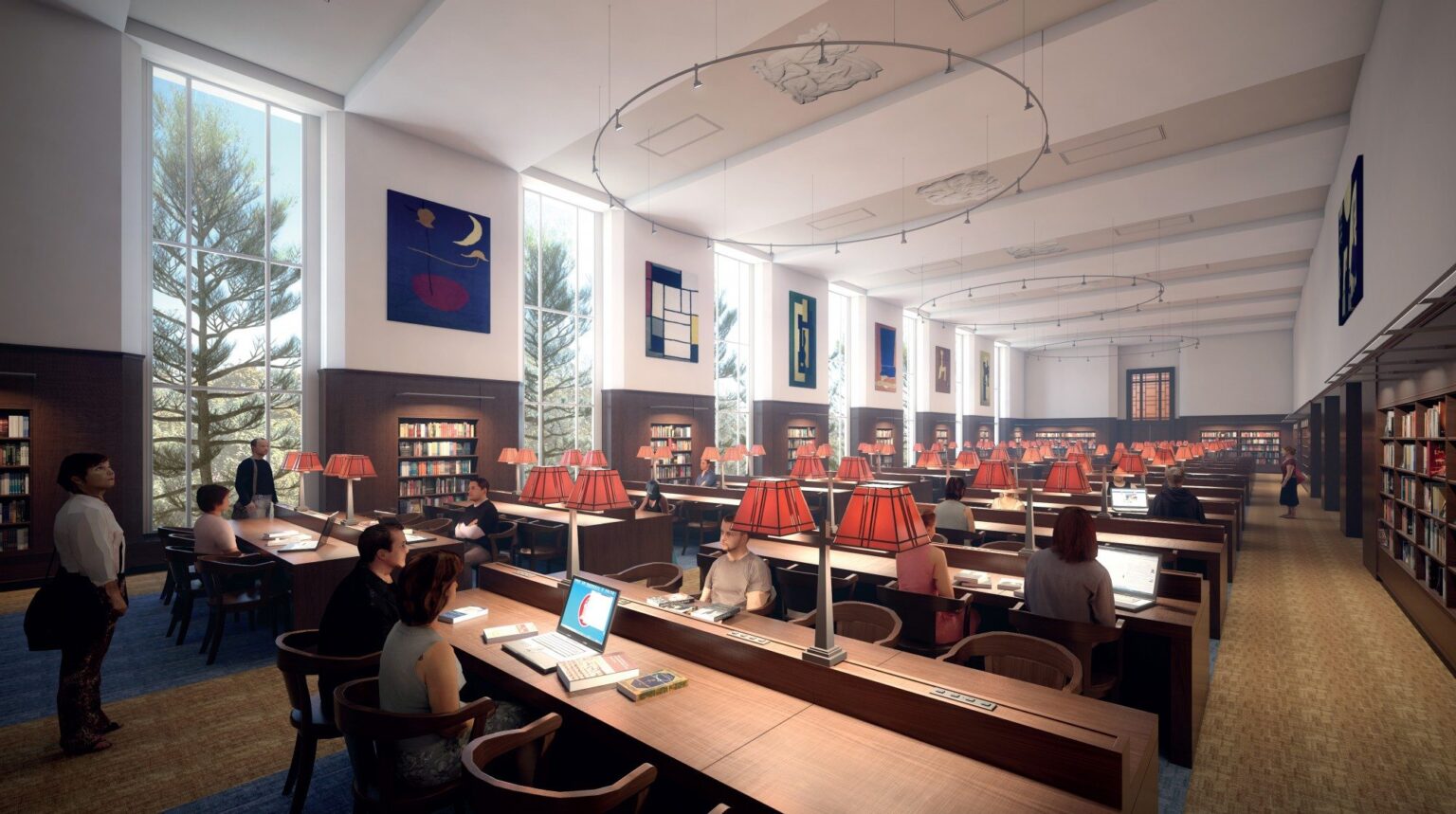 The proposed plan densifies collections by making better use of compact shelving, resulting in a net gain in square footage for user functions, and consolidates the special collections library for improved security, adjacencies, and workflow. The new plan increases and improves user spaces, emphasizes the focus on technology, consolidates service points, and creates new functions such as an auditorium, collaborative computing suite, and café, while addressing major infrastructure improvements. The original grand reading room, now cannibalized for collections functions, will be restored as the library’s signature space.