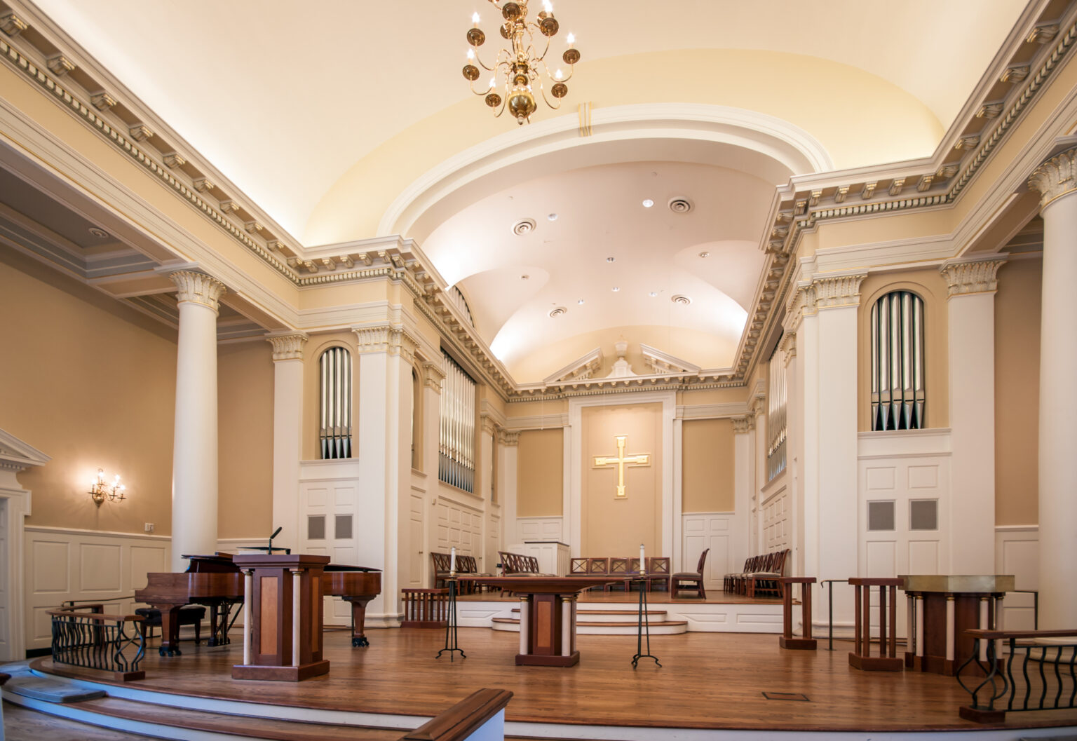 Renovation of this 1951 collegiate Georgian chapel on the Southern Methodist University campus was one of the first initiatives to be implemented out of GFF’s Centennial Master Plan. A sought-after wedding venue as well as a space for worship and teaching, meeting the needs of a wide variety of contemporary users required enhanced infrastructure and flexibility. The chancel was extended and reconfigured with new furniture, and new mechanical systems, lighting, audio-visual and acoustical improvements were added, along with improvements to handicap accessibility. A new color scheme incorporating subtle white-on-white shade variations and gold leaf accents enlivens the space and heightens visibility of the interior details.