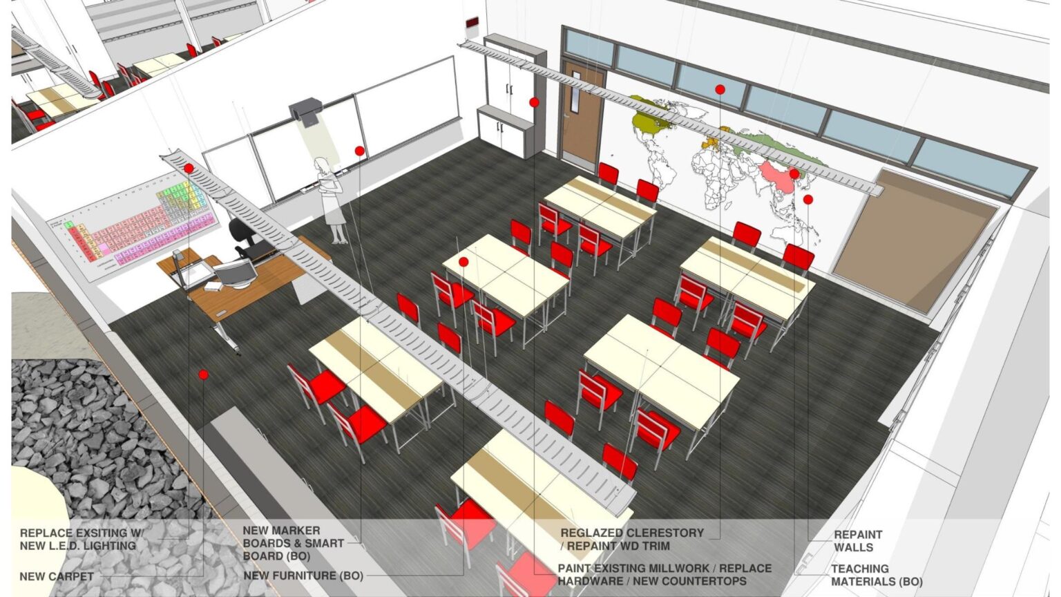 The design emphasized creating a new atrium entrance to enhance campus security while providing an architecturally unifying element that integrates older classroom buildings with more recent additions. Additionally, new enclosed links were proposed to connect all classroom wings into a single enclosed and secured environment. All existing classrooms were updated, with direct access to two outdoor learning courtyards designed to enhance science and art education.