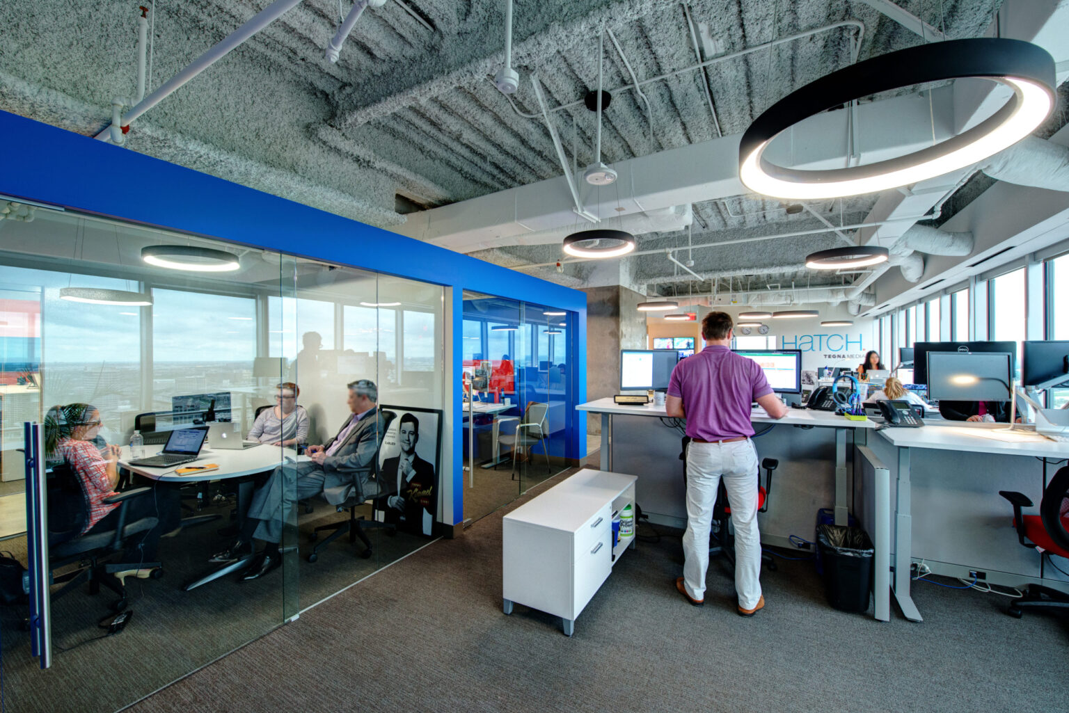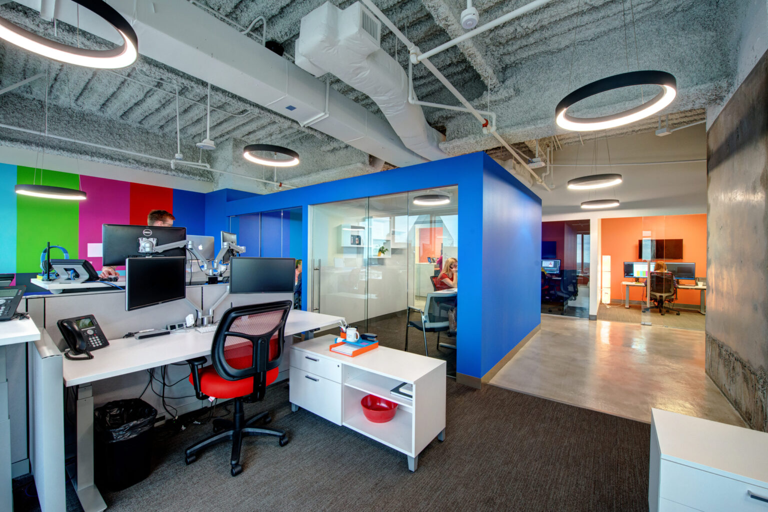 TEGNA Media includes television stations across the US, and they created their “HATCH” group in order to collaboratively “Hatch” new ideas for televised marketing strategies that evolve with their changing market. This department was built from the ground-up, and they wanted an open work environment that inspired creativity and a sense of community as if they started in their own garage. The design was intended to pull back the existing refined finishes that carry through the rest of the adjacent TEGNA office, and pull in a rawness of materials and expose the architecture to add a level of comfort to enhance the creative thinking process as if they were a start-up company. The Hatch area is still tied to the rest of the office space by utilizing existing carpet and furniture, but the bold pops of color, unique lighting, large-scale graphic nods to their television roots, and exposed structure define this area as their own. The renovation was approximately 3200 SF, but packed a big punch.