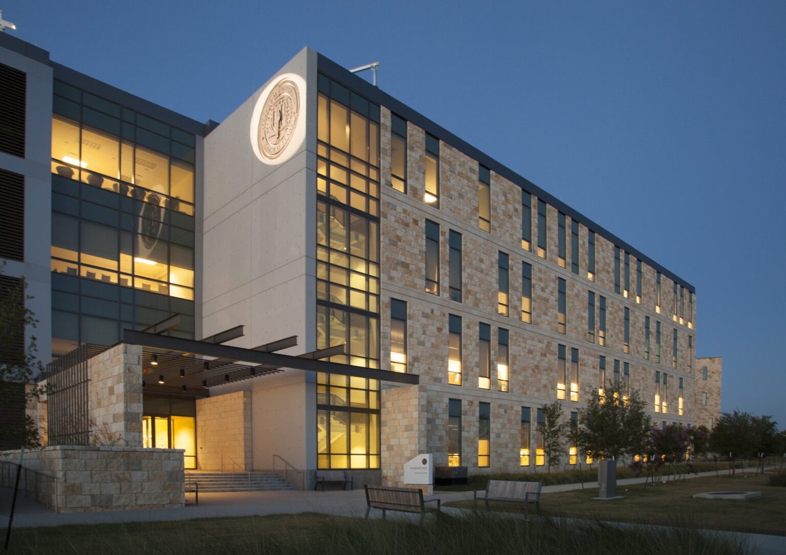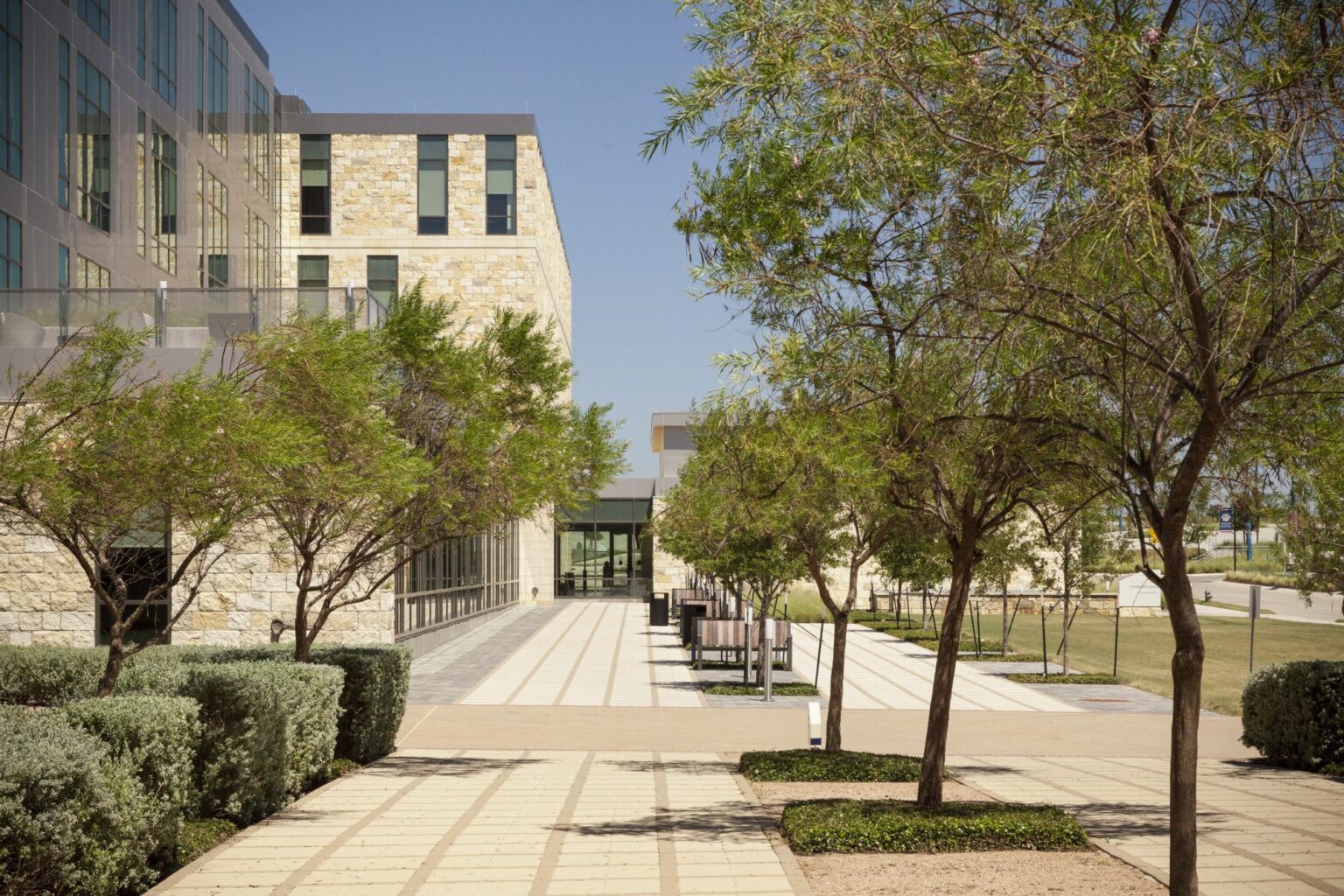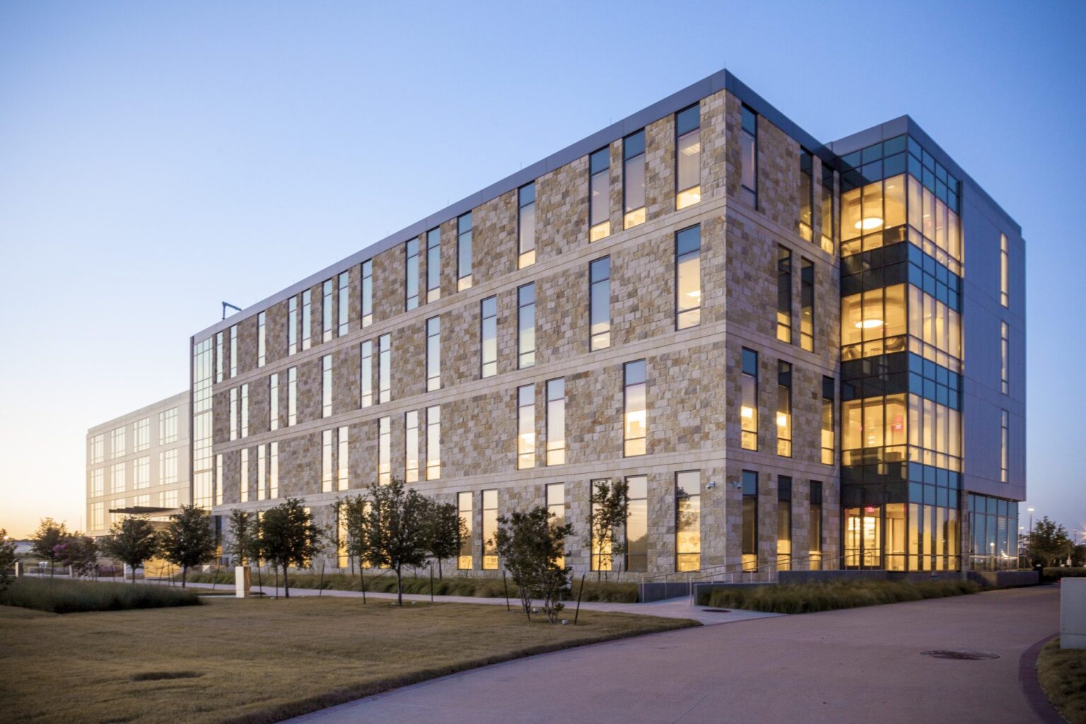 The exterior of the new building combines local rough limestone with precisely machined aluminum panels, acknowledging Central Texas architectural heritage while looking to the future. The first and second buildings together begin to delineate exterior campus spaces, creating not just a collection of structures but outdoor places that will ultimately define the character of the campus.