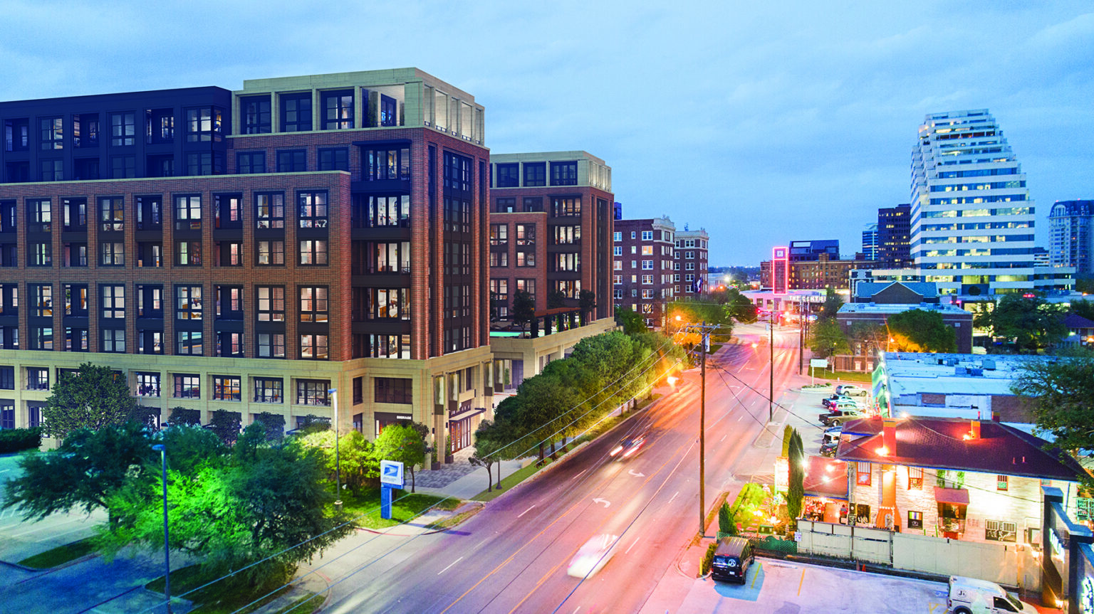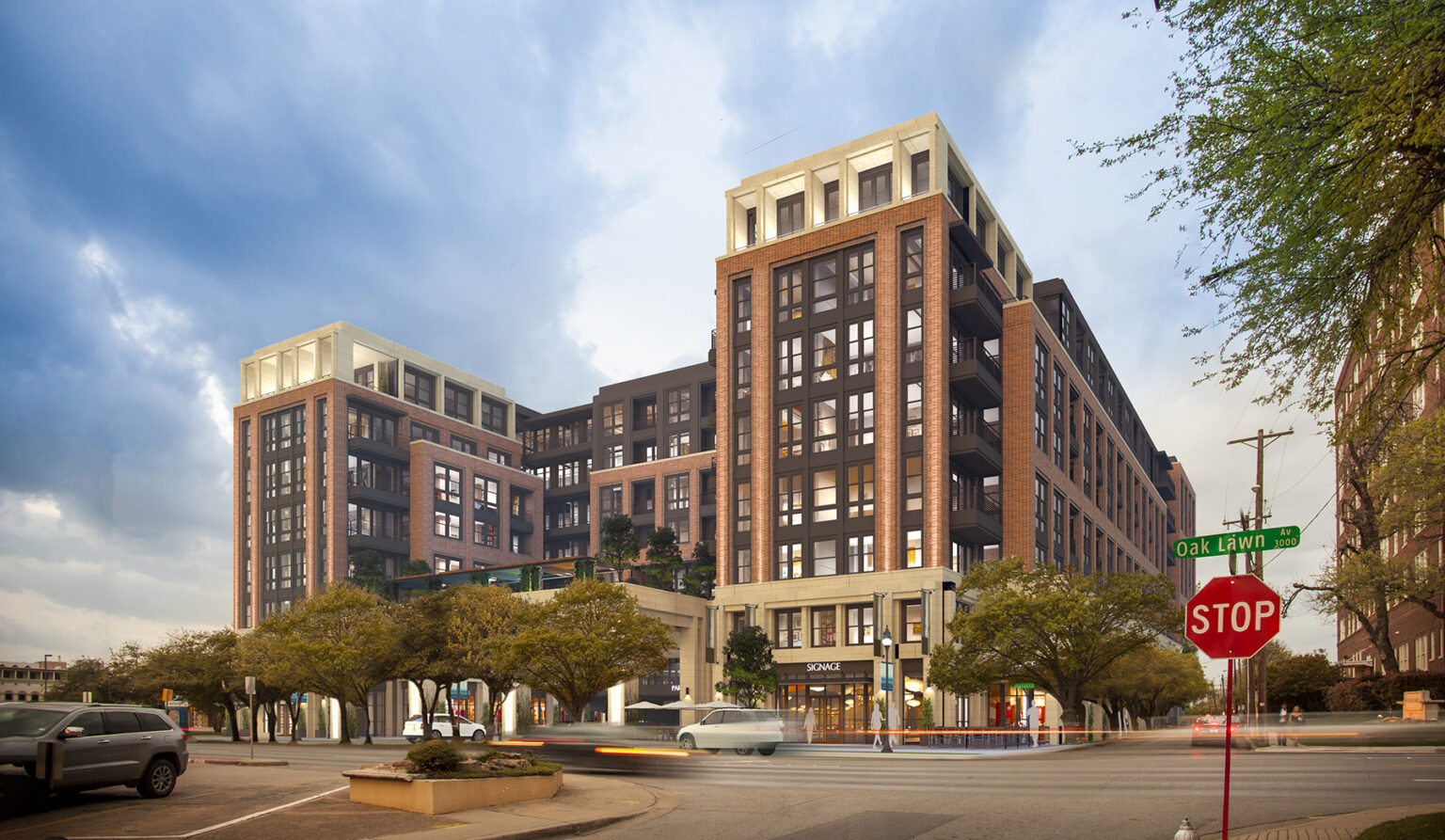 Amenities, including a pool, will be located on level 3 within a courtyard that opens to Oak Lawn. The building design preserves many of the mature live oak trees along Oak Lawn and Dickason Avenue, contributing to the area’s green and inviting streetscape.