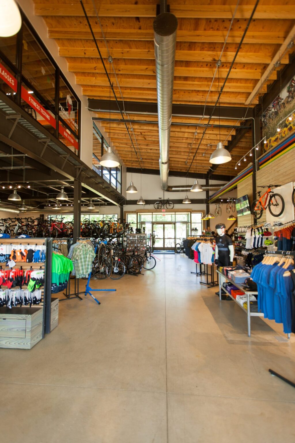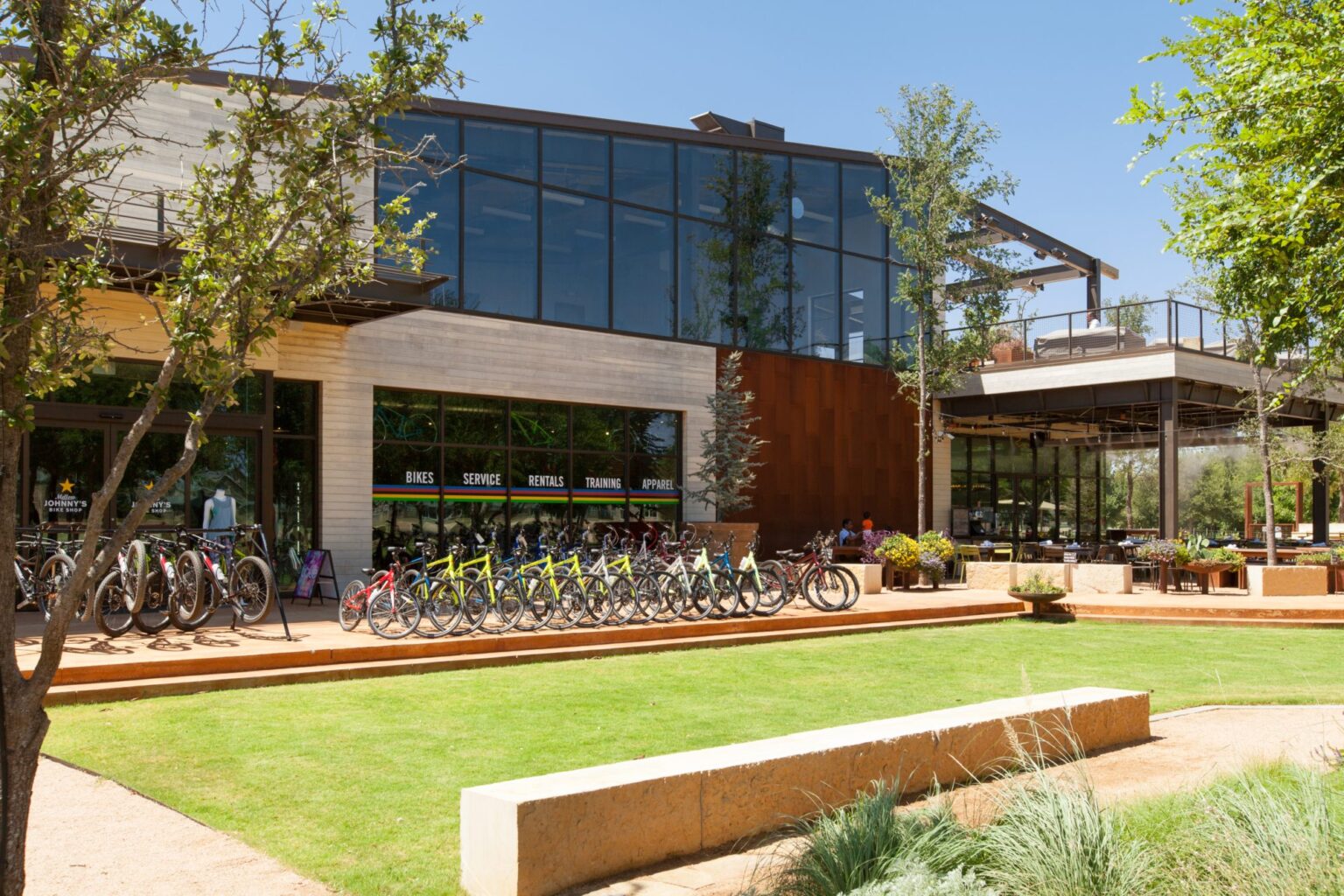 The program for the 13,700-square-foot building includes a bike shop, yoga studio, coffee shop, and beer garden. These functions are arranged on two levels in a building with an informal spirit and contemporary form that seamlessly merges interior and exterior spaces.