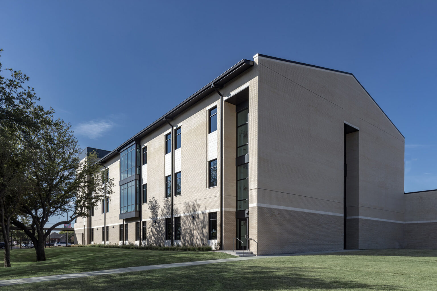 The first new building arising from the master plan, a new 45,000 square foot Middle School, accommodates 7th and 8th grades and anchors a newly emphasized entrance to the campus with a loop drive and drop-off, a landscaped forecourt, and reconfigured parking, providing a place of arrival for the Middle School. Facilities for grades 5 and 6 and a 600-seat chapel will be provided in a future addition. Buff brick and cast stone details convey a sense of quality without overpowering the adjacent tan stucco buildings. The Middle School’s simple massing is accented by a glazed stair tower and an extended covered walkway which provides a pedestrian connection to the existing campus buildings. The regular pattern of paired windows is broken by a second and third floor bay of floor-to-ceiling glass marking collaboration spaces overlooking the new campus green. The new Middle School sets the stage for future buildings and provides an aesthetic that expresses the long-term vision of Trinity Christian Academy.