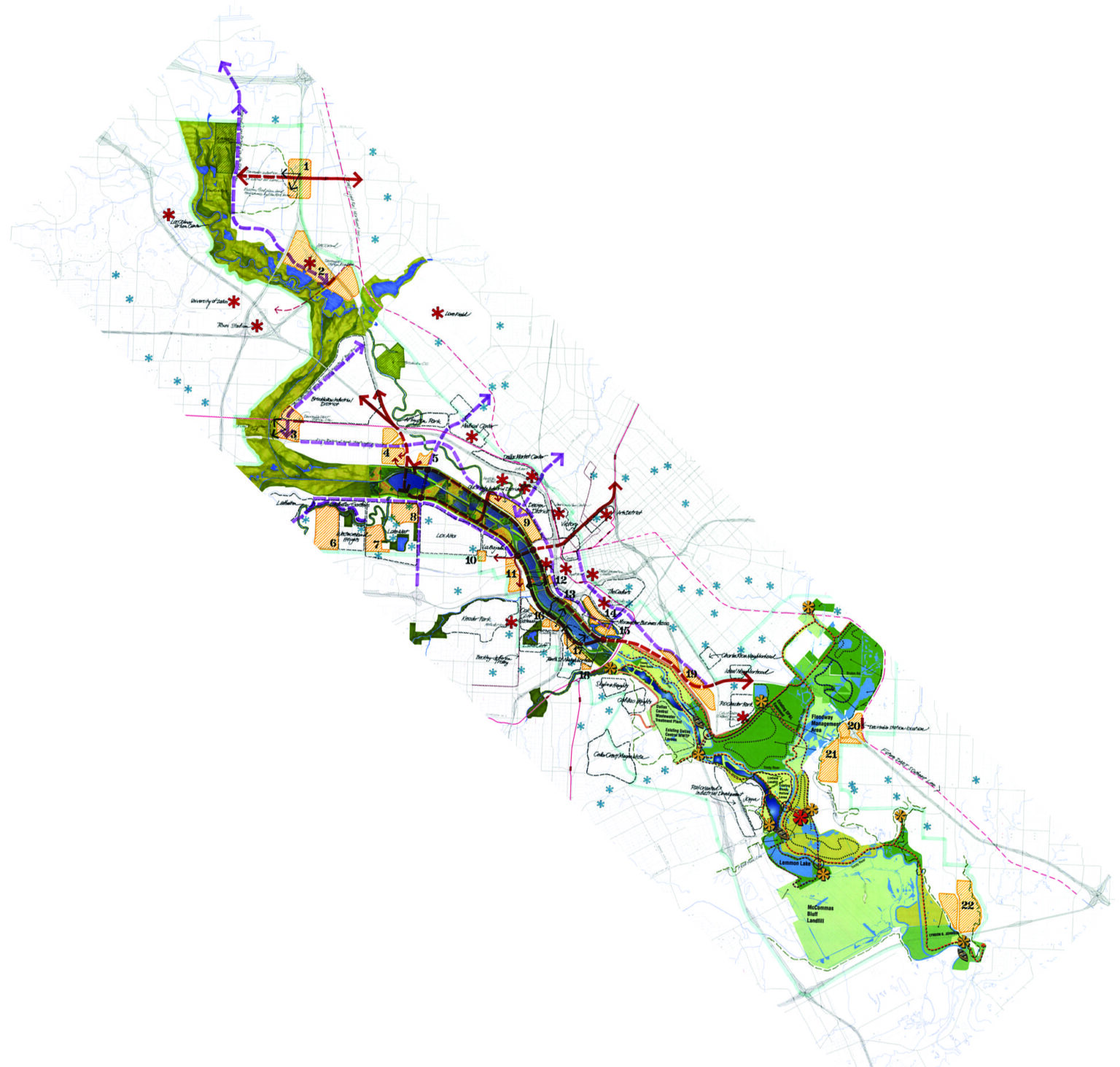 GFF, in collaboration with HNTB, led the effort to establish a comprehensive land use policy for the corridor, predicting the economic impact of this significant public investment. As urban design specialists, GFF prepared urban design framework studies for each of the 22 primary study areas along the river and illustrated prototype development configurations on 10 high-profile sites. The goal was to create a cohesive vision for the corridor that integrates flood control, transportation, recreation, and environmental preservation.