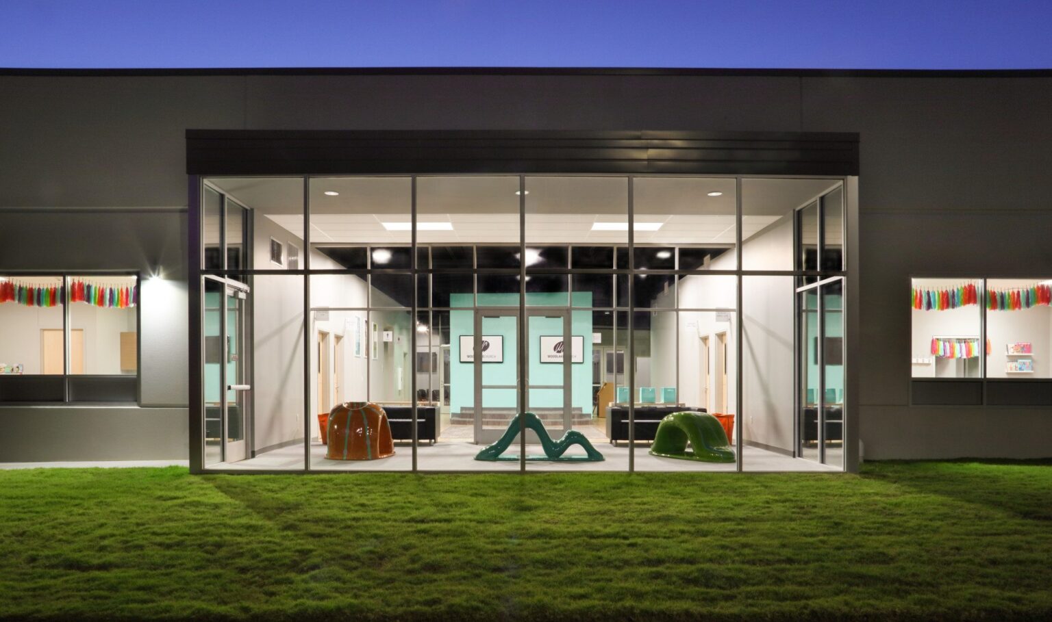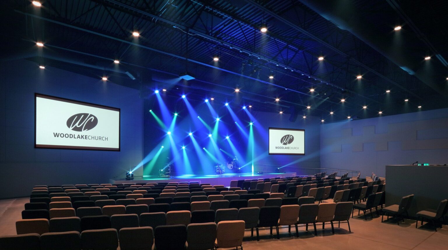 The design of the building incorporates a range of modern materials and features, including anodized aluminum canopies, painted concrete tilt walls, wood grain fiber cement siding, corrugated metal panels, and stucco. The interior of the building boasts a loft-like commons area with exposed structure, stained concrete flooring, clear-sealed MDF paneling, and painted drywall. Brightly colored furnishings and accent walls add a vibrant touch to the space, creating a welcoming environment for both the main and children’s worship spaces. The contemporary worship experience is enhanced by state-of-the-art lighting and audio-video equipment. The design not only accommodates the needs of the congregation but also aims to integrate seamlessly into the surrounding community, making Woodlake Church a significant hub for spiritual and social gatherings.